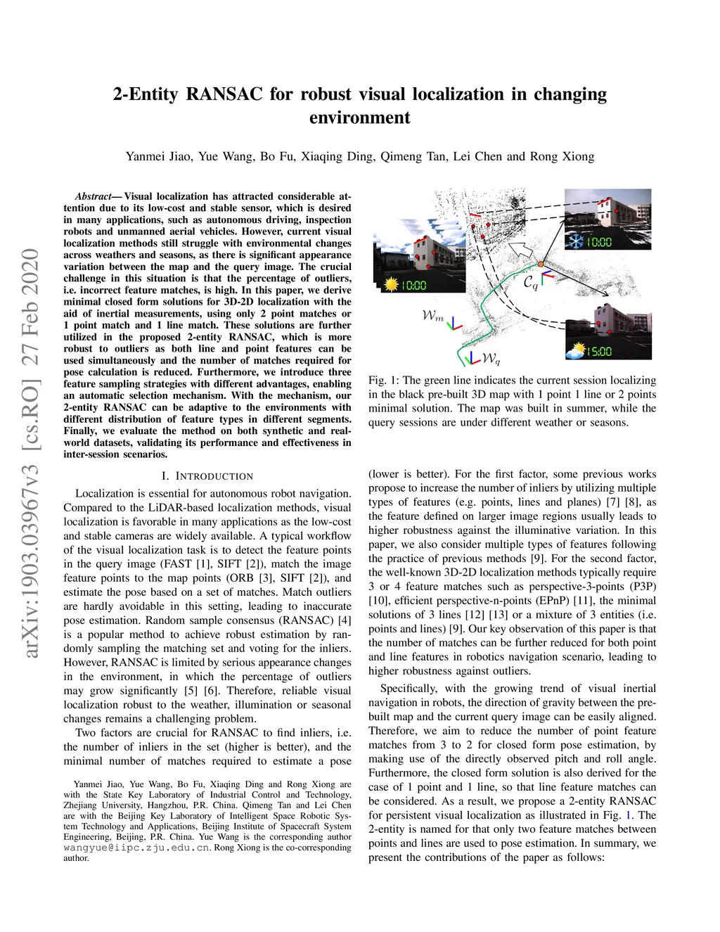 Visual localization has attracted considerable attention due to its low-cost and stable sensor, which is desired in many applications, such as autonomous driving, inspection robots and unmanned aerial vehicles. However, current visual localization methods still struggle with environmental changes across weathers and seasons, as there is significant appearance variation between the map and the query image. The crucial challenge in this situation is that the percentage of outliers, i.e. incorrect feature matches, is high. In this paper, we derive minimal closed form solutions for 3D-2D localization with the aid of inertial measurements, using only 2 pairs of point matches or 1 pair of point match and 1 pair of line match. These solutions are further utilized in the proposed 2-entity RANSAC, which is more robust to outliers as both line and point features can be used simultaneously and the number of matches required for pose calculation is reduced. Furthermore, we introduce three feature sampling strategies with different advantages, enabling an automatic selection mechanism. With the mechanism, our 2-entity RANSAC can be adaptive to the environments with different distribution of feature types in different segments. Finally, we evaluate the method on both synthetic and real-world datasets, validating its performance and effectiveness in inter-session scenarios.