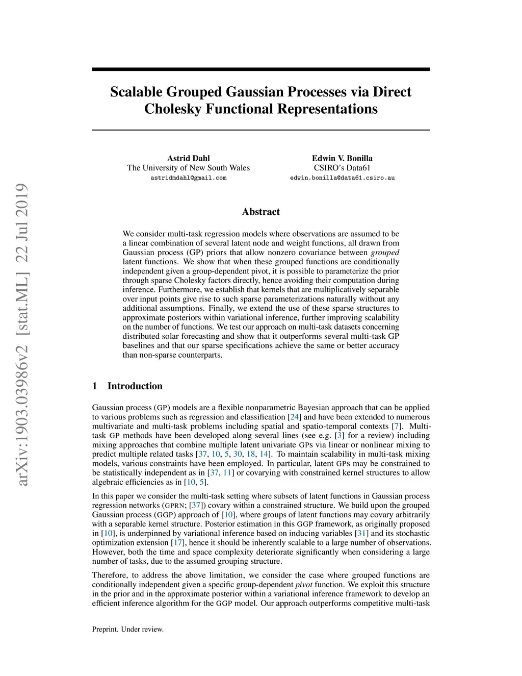 We consider multi-task regression models where observations are assumed to be a linear combination of several latent node and weight functions, all drawn from Gaussian process priors that allow nonzero covariance between grouped latent functions. Motivated by the problem of developing scalable methods for distributed solar forecasting, we exploit sparse covariance structures where latent functions are assumed to be conditionally independent given a group-pivot latent function. We exploit properties of multivariate Gaussians to construct sparse Cholesky factors directly, rather than obtaining them through iterative routines, and by doing so achieve significantly improved time and memory complexity including prediction complexity that is linear in the number of grouped functions. We test our approach on large multi-task datasets and find that sparse specifications achieve the same or better accuracy than non-sparse counterparts in less time, and improve on benchmark model accuracy.