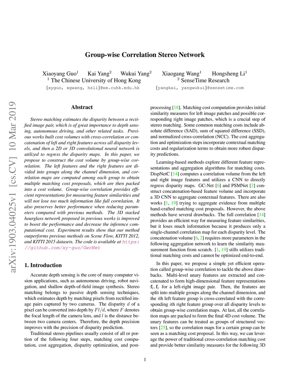 Stereo matching estimates the disparity between a rectified image pair, which is of great importance to depth sensing, autonomous driving, and other related tasks. Previous works built cost volumes with cross-correlation or concatenation of left and right features across all disparity levels, and then a 2D or 3D convolutional neural network is utilized to regress the disparity maps. In this paper, we propose to construct the cost volume by group-wise correlation. The left features and the right features are divided into groups along the channel dimension, and correlation maps are computed among each group to obtain multiple matching cost proposals, which are then packed into a cost volume. Group-wise correlation provides efficient representations for measuring feature similarities and will not lose too much information like full correlation. It also preserves better performance when reducing parameters compared with previous methods. The 3D stacked hourglass network proposed in previous works is improved to boost the performance and decrease the inference computational cost. Experiment results show that our method outperforms previous methods on Scene Flow, KITTI 2012, and KITTI 2015 datasets. The code is available at https://github.com/xy-guo/GwcNet