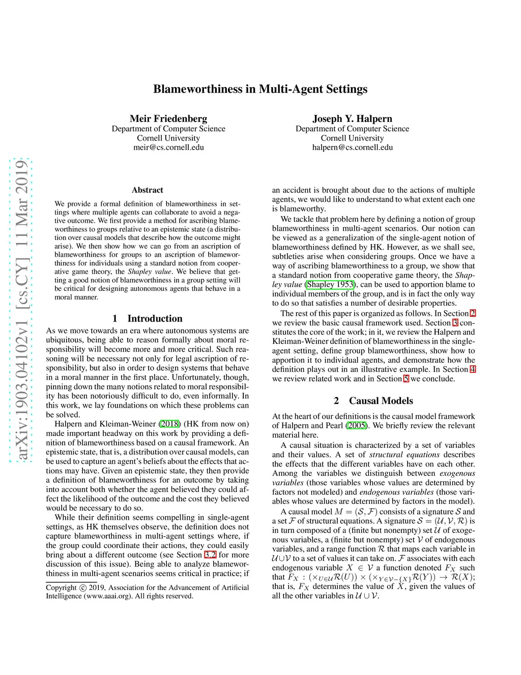 We provide a formal definition of blameworthiness in settings where multiple agents can collaborate to avoid a negative outcome. We first provide a method for ascribing blameworthiness to groups relative to an epistemic state (a distribution over causal models that describe how the outcome might arise). We then show how we can go from an ascription of blameworthiness for groups to an ascription of blameworthiness for individuals using a standard notion from cooperative game theory, the Shapley value. We believe that getting a good notion of blameworthiness in a group setting will be critical for designing autonomous agents that behave in a moral manner.