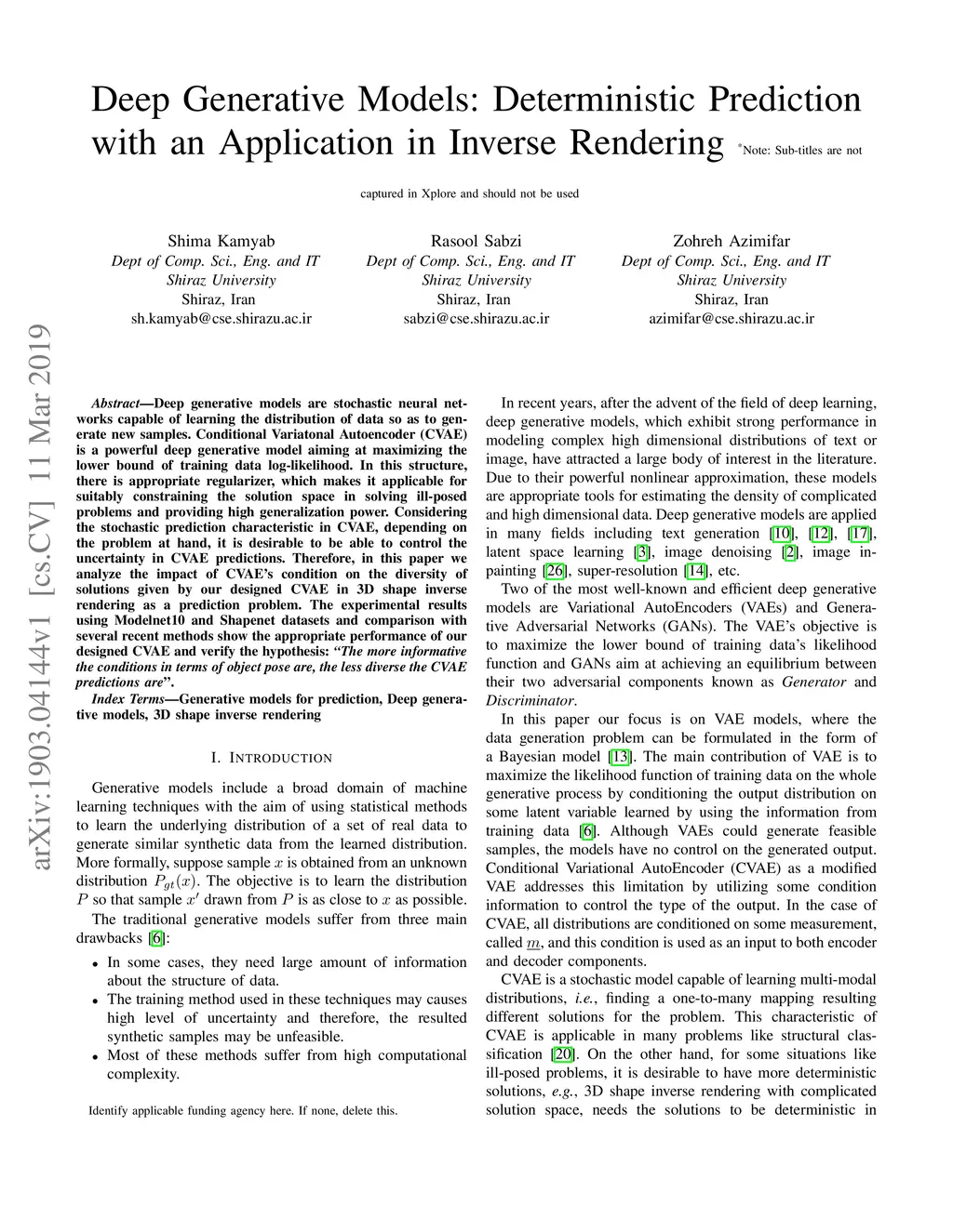 Deep generative models are stochastic neural networks capable of learning the distribution of data so as to generate new samples. Conditional Variational Autoencoder (CVAE) is a powerful deep generative model aiming at maximizing the lower bound of training data log-likelihood. In the CVAE structure, there is appropriate regularizer, which makes it applicable for suitably constraining the solution space in solving ill-posed problems and providing high generalization power. Considering the stochastic prediction characteristic in CVAE, depending on the problem at hand, it is desirable to be able to control the uncertainty in CVAE predictions. Therefore, in this paper we analyze the impact of CVAE's condition on the diversity of solutions given by our designed CVAE in 3D shape inverse rendering as a prediction problem. The experimental results using Modelnet10 and Shapenet datasets show the appropriate performance of our designed CVAE and verify the hypothesis: \emph{"The more informative the conditions in terms of object pose are, the less diverse the CVAE predictions are}".