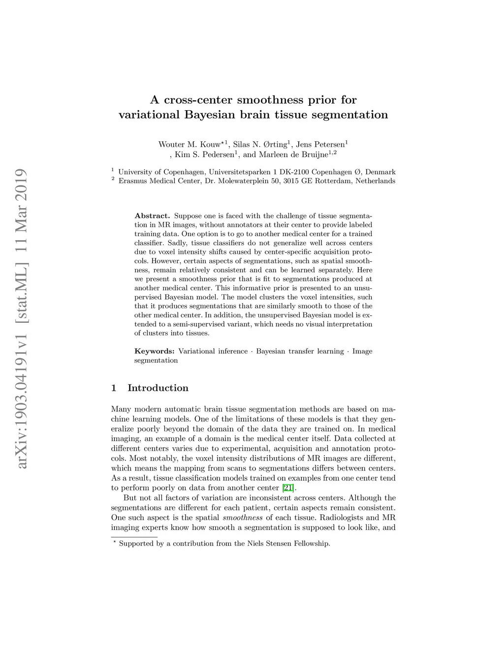 Suppose one is faced with the challenge of tissue segmentation in MR images, without annotators at their center to provide labeled training data. One option is to go to another medical center for a trained classifier. Sadly, tissue classifiers do not generalize well across centers due to voxel intensity shifts caused by center-specific acquisition protocols. However, certain aspects of segmentations, such as spatial smoothness, remain relatively consistent and can be learned separately. Here we present a smoothness prior that is fit to segmentations produced at another medical center. This informative prior is presented to an unsupervised Bayesian model. The model clusters the voxel intensities, such that it produces segmentations that are similarly smooth to those of the other medical center. In addition, the unsupervised Bayesian model is extended to a semi-supervised variant, which needs no visual interpretation of clusters into tissues.