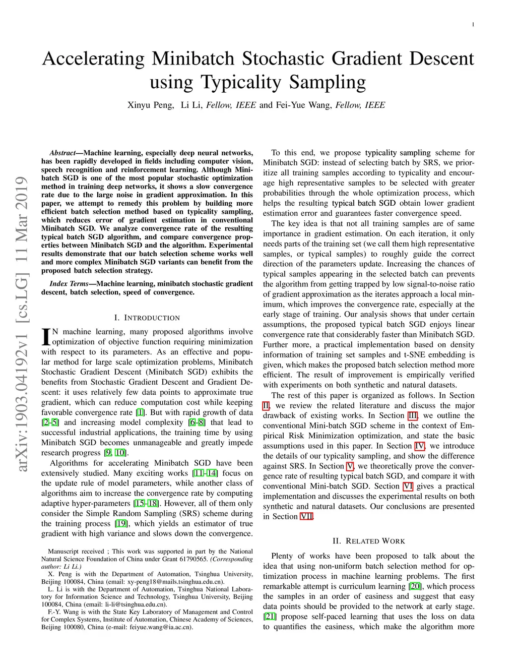 Machine learning, especially deep neural networks, has been rapidly developed in fields including computer vision, speech recognition and reinforcement learning. Although Mini-batch SGD is one of the most popular stochastic optimization methods in training deep networks, it shows a slow convergence rate due to the large noise in gradient approximation. In this paper, we attempt to remedy this problem by building more efficient batch selection method based on typicality sampling, which reduces the error of gradient estimation in conventional Minibatch SGD. We analyze the convergence rate of the resulting typical batch SGD algorithm and compare convergence properties between Minibatch SGD and the algorithm. Experimental results demonstrate that our batch selection scheme works well and more complex Minibatch SGD variants can benefit from the proposed batch selection strategy.