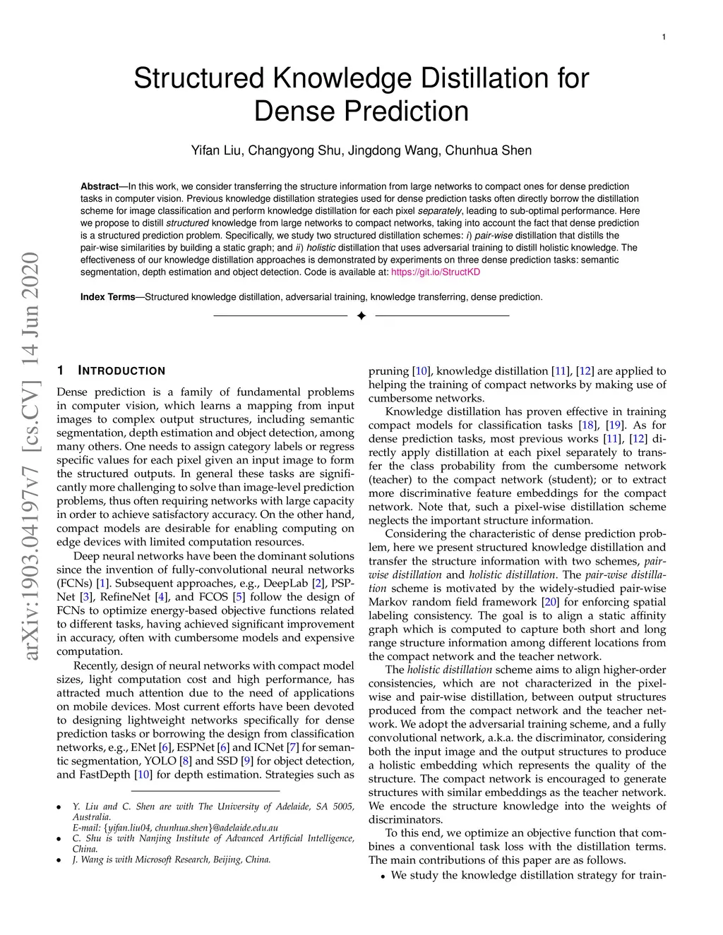 In this work, we consider transferring the structure information from large networks to compact ones for dense prediction tasks in computer vision. Previous knowledge distillation strategies used for dense prediction tasks often directly borrow the distillation scheme for image classification and perform knowledge distillation for each pixel separately, leading to sub-optimal performance. Here we propose to distill structured knowledge from large networks to compact networks, taking into account the fact that dense prediction is a structured prediction problem. Specifically, we study two structured distillation schemes: i) pair-wise distillation that distills the pair-wise similarities by building a static graph; and ii) holistic distillation that uses adversarial training to distill holistic knowledge. The effectiveness of our knowledge distillation approaches is demonstrated by experiments on three dense prediction tasks: semantic segmentation, depth estimation and object detection. Code is available at: https://git.io/StructKD