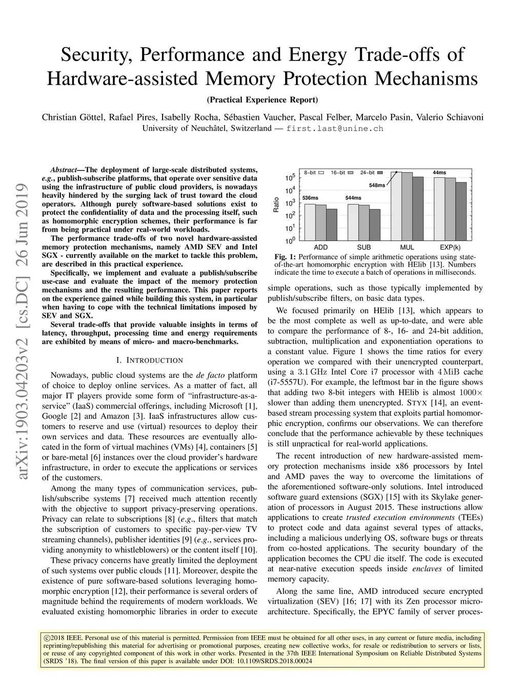 The deployment of large-scale distributed systems, e.g., publish-subscribe platforms, that operate over sensitive data using the infrastructure of public cloud providers, is nowadays heavily hindered by the surging lack of trust toward the cloud operators. Although purely software-based solutions exist to protect the confidentiality of data and the processing itself, such as homomorphic encryption schemes, their performance is far from being practical under real-world workloads. The performance trade-offs of two novel hardware-assisted memory protection mechanisms, namely AMD SEV and Intel SGX - currently available on the market to tackle this problem, are described in this practical experience. Specifically, we implement and evaluate a publish/subscribe use-case and evaluate the impact of the memory protection mechanisms and the resulting performance. This paper reports on the experience gained while building this system, in particular when having to cope with the technical limitations imposed by SEV and SGX. Several trade-offs that provide valuable insights in terms of latency, throughput, processing time and energy requirements are exhibited by means of micro- and macro-benchmarks.