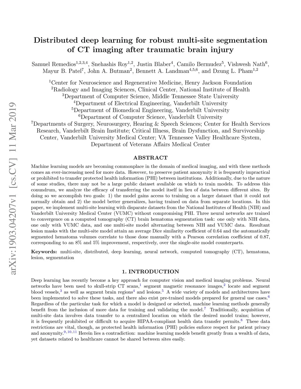 Machine learning models are becoming commonplace in the domain of medical imaging, and with these methods comes an ever-increasing need for more data. However, to preserve patient anonymity it is frequently impractical or prohibited to transfer protected health information (PHI) between institutions. Additionally, due to the nature of some studies, there may not be a large public dataset available on which to train models. To address this conundrum, we analyze the efficacy of transferring the model itself in lieu of data between different sites. By doing so we accomplish two goals: 1) the model gains access to training on a larger dataset that it could not normally obtain and 2) the model better generalizes, having trained on data from separate locations. In this paper, we implement multi-site learning with disparate datasets from the National Institutes of Health (NIH) and Vanderbilt University Medical Center (VUMC) without compromising PHI. Three neural networks are trained to convergence on a computed tomography (CT) brain hematoma segmentation task: one only with NIH data,one only with VUMC data, and one multi-site model alternating between NIH and VUMC data. Resultant lesion masks with the multi-site model attain an average Dice similarity coefficient of 0.64 and the automatically segmented hematoma volumes correlate to those done manually with a Pearson correlation coefficient of 0.87,corresponding to an 8% and 5% improvement, respectively, over the single-site model counterparts.