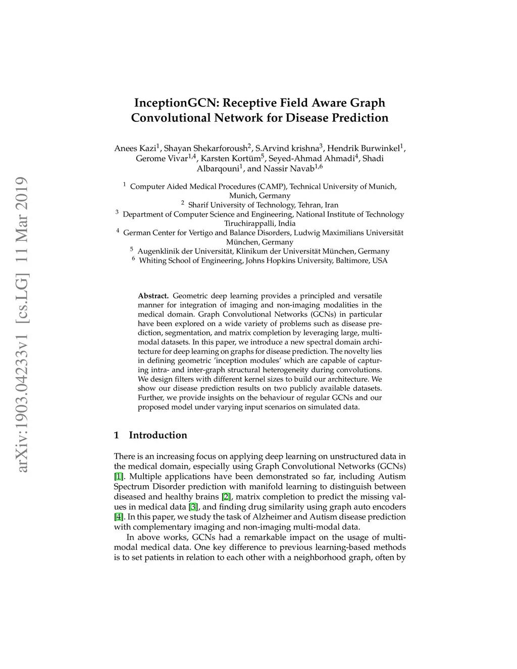 Geometric deep learning provides a principled and versatile manner for the integration of imaging and non-imaging modalities in the medical domain. Graph Convolutional Networks (GCNs) in particular have been explored on a wide variety of problems such as disease prediction, segmentation, and matrix completion by leveraging large, multimodal datasets. In this paper, we introduce a new spectral domain architecture for deep learning on graphs for disease prediction. The novelty lies in defining geometric ínception modules' which are capable of capturing intra- and inter-graph structural heterogeneity during convolutions. We design filters with different kernel sizes to build our architecture. We show our disease prediction results on two publicly available datasets. Further, we provide insights on the behaviour of regular GCNs and our proposed model under varying input scenarios on simulated data.