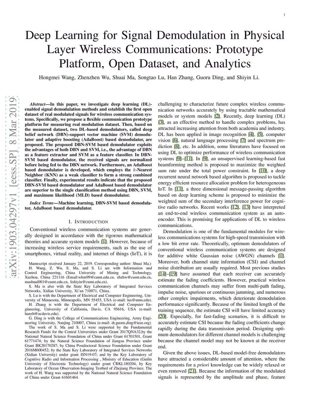 In this paper, we investigate deep learning (DL)-enabled signal demodulation methods and establish the first open dataset of real modulated signals for wireless communication systems. Specifically, we propose a flexible communication prototype platform for measuring real modulation dataset. Then, based on the measured dataset, two DL-based demodulators, called deep belief network (DBN)-support vector machine (SVM) demodulator and adaptive boosting (AdaBoost) based demodulator, are proposed. The proposed DBN-SVM based demodulator exploits the advantages of both DBN and SVM, i.e., the advantage of DBN as a feature extractor and SVM as a feature classifier. In DBN-SVM based demodulator, the received signals are normalized before being fed to the DBN network. Furthermore, an AdaBoost based demodulator is developed, which employs the -Nearest Neighbor (KNN) as a weak classifier to form a strong combined classifier. Finally, experimental results indicate that the proposed DBN-SVM based demodulator and AdaBoost based demodulator are superior to the single classification method using DBN, SVM, and maximum likelihood (MLD) based demodulator.