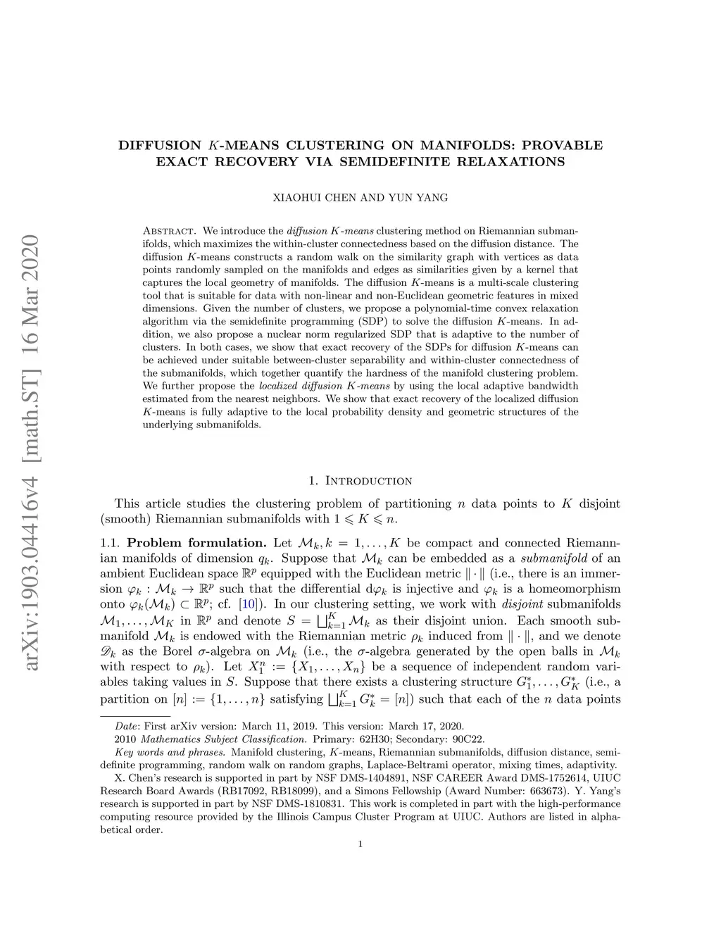 We introduce the {\it diffusion -means} clustering method on Riemannian submanifolds, which maximizes the within-cluster connectedness based on the diffusion distance. The diffusion -means constructs a random walk on the similarity graph with vertices as data points randomly sampled on the manifolds and edges as similarities given by a kernel that captures the local geometry of manifolds. The diffusion -means is a multi-scale clustering tool that is suitable for data with non-linear and non-Euclidean geometric features in mixed dimensions. Given the number of clusters, we propose a polynomial-time convex relaxation algorithm via the semidefinite programming (SDP) to solve the diffusion -means. In addition, we also propose a nuclear norm regularized SDP that is adaptive to the number of clusters. In both cases, we show that exact recovery of the SDPs for diffusion -means can be achieved under suitable between-cluster separability and within-cluster connectedness of the submanifolds, which together quantify the hardness of the manifold clustering problem. We further propose the {\it localized diffusion -means} by using the local adaptive bandwidth estimated from the nearest neighbors. We show that exact recovery of the localized diffusion -means is fully adaptive to the local probability density and geometric structures of the underlying submanifolds.