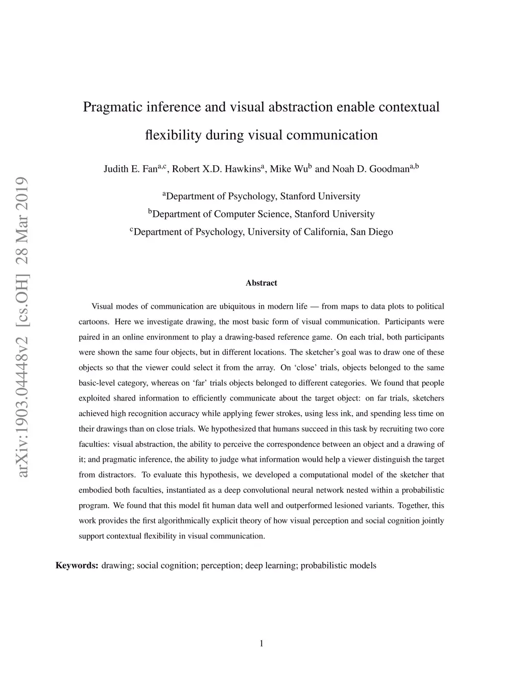 Visual modes of communication are ubiquitous in modern life --- from maps to data plots to political cartoons. Here we investigate drawing, the most basic form of visual communication. Participants were paired in an online environment to play a drawing-based reference game. On each trial, both participants were shown the same four objects, but in different locations. The sketcher's goal was to draw one of these objects so that the viewer could select it from the array. On `close' trials, objects belonged to the same basic-level category, whereas on `far' trials objects belonged to different categories. We found that people exploited shared information to efficiently communicate about the target object: on far trials, sketchers achieved high recognition accuracy while applying fewer strokes, using less ink, and spending less time on their drawings than on close trials. We hypothesized that humans succeed in this task by recruiting two core faculties: visual abstraction, the ability to perceive the correspondence between an object and a drawing of it; and pragmatic inference, the ability to judge what information would help a viewer distinguish the target from distractors. To evaluate this hypothesis, we developed a computational model of the sketcher that embodied both faculties, instantiated as a deep convolutional neural network nested within a probabilistic program. We found that this model fit human data well and outperformed lesioned variants. Together, this work provides the first algorithmically explicit theory of how visual perception and social cognition jointly support contextual flexibility in visual communication.
