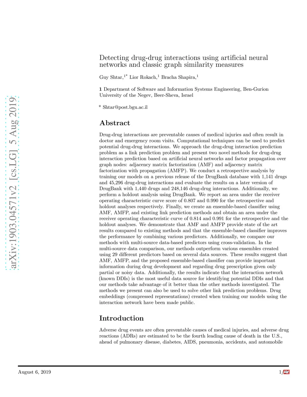 Drug-drug interactions are preventable causes of medical injuries and often result in doctor and emergency room visits. Computational techniques can be used to predict potential drug-drug interactions. We approach the drug-drug interaction prediction problem as a link prediction problem and present two novel methods for drug-drug interaction prediction based on artificial neural networks and factor propagation over graph nodes: adjacency matrix factorization (AMF) and adjacency matrix factorization with propagation (AMFP). We conduct a retrospective analysis by training our models on a previous release of the DrugBank database with 1,141 drugs and 45,296 drug-drug interactions and evaluate the results on a later version of DrugBank with 1,440 drugs and 248,146 drug-drug interactions. Additionally, we perform a holdout analysis using DrugBank. We report an area under the receiver operating characteristic curve score of 0.807 and 0.990 for the retrospective and holdout analyses respectively. Finally, we create an ensemble-based classifier using AMF, AMFP, and existing link prediction methods and obtain an area under the receiver operating characteristic curve of 0.814 and 0.991 for the retrospective and the holdout analyses. We demonstrate that AMF and AMFP provide state of the art results compared to existing methods and that the ensemble-based classifier improves the performance by combining various predictors. These results suggest that AMF, AMFP, and the proposed ensemble-based classifier can provide important information during drug development and regarding drug prescription given only partial or noisy data. These methods can also be used to solve other link prediction problems. Drug embeddings (compressed representations) created when training our models using the interaction network have been made public.