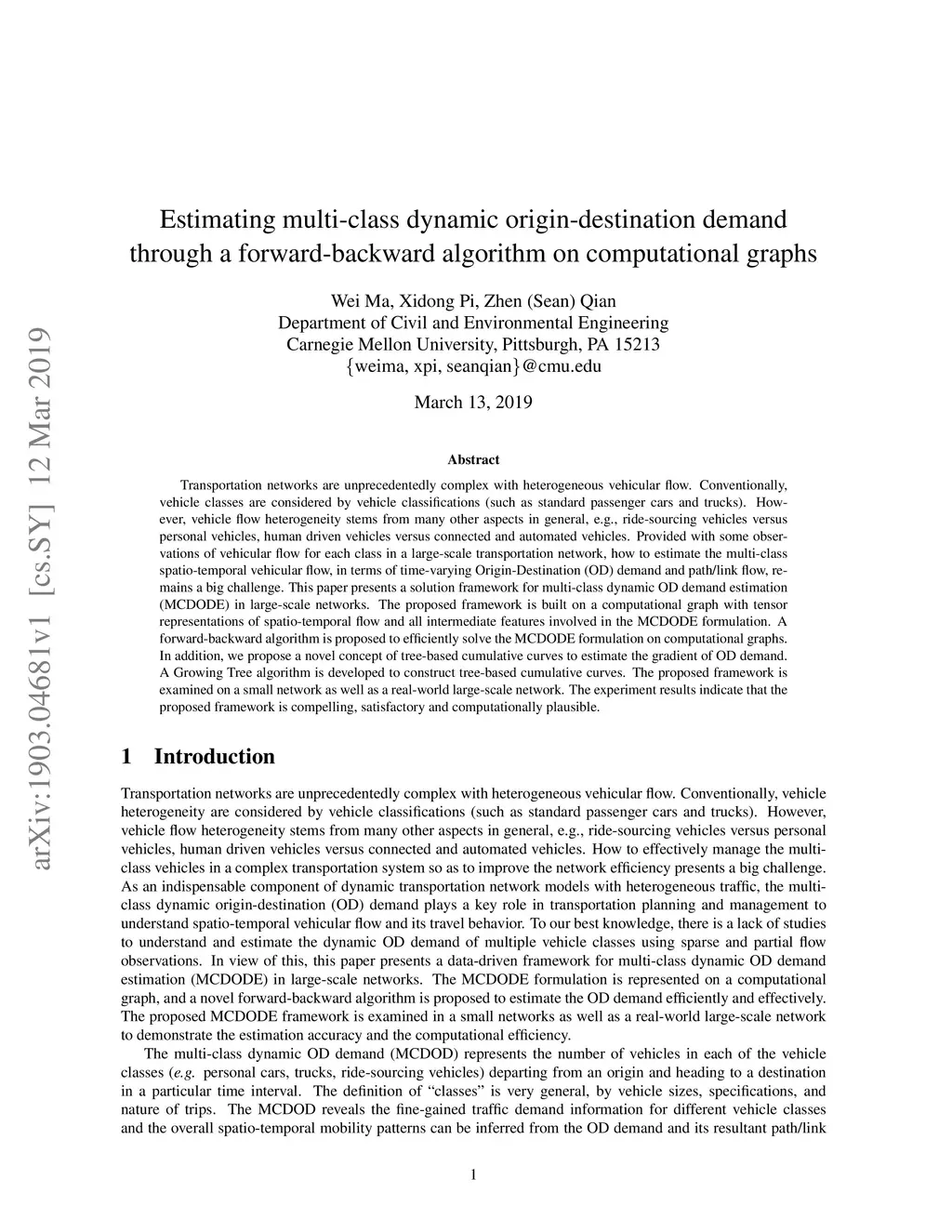 Transportation networks are unprecedentedly complex with heterogeneous vehicular flow. Conventionally, vehicle classes are considered by vehicle classifications (such as standard passenger cars and trucks). However, vehicle flow heterogeneity stems from many other aspects in general, e.g., ride-sourcing vehicles versus personal vehicles, human driven vehicles versus connected and automated vehicles. Provided with some observations of vehicular flow for each class in a large-scale transportation network, how to estimate the multi-class spatio-temporal vehicular flow, in terms of time-varying Origin-Destination (OD) demand and path/link flow, remains a big challenge. This paper presents a solution framework for multi-class dynamic OD demand estimation (MCDODE) in large-scale networks. The proposed framework is built on a computational graph with tensor representations of spatio-temporal flow and all intermediate features involved in the MCDODE formulation. A forward-backward algorithm is proposed to efficiently solve the MCDODE formulation on computational graphs. In addition, we propose a novel concept of tree-based cumulative curves to estimate the gradient of OD demand. A Growing Tree algorithm is developed to construct tree-based cumulative curves. The proposed framework is examined on a small network as well as a real-world large-scale network. The experiment results indicate that the proposed framework is compelling, satisfactory and computationally plausible.