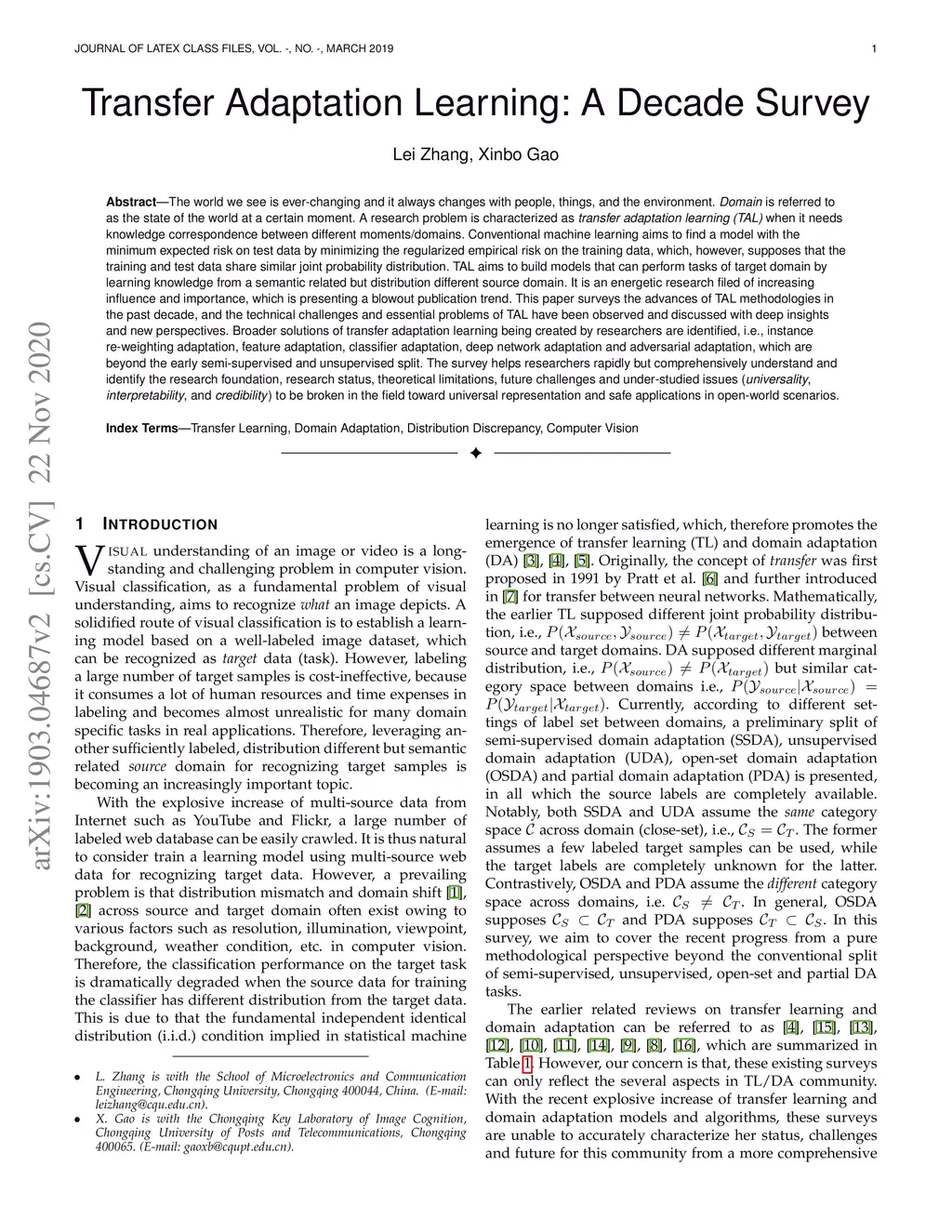 Transfer Adaptation Learning: A Decade Survey