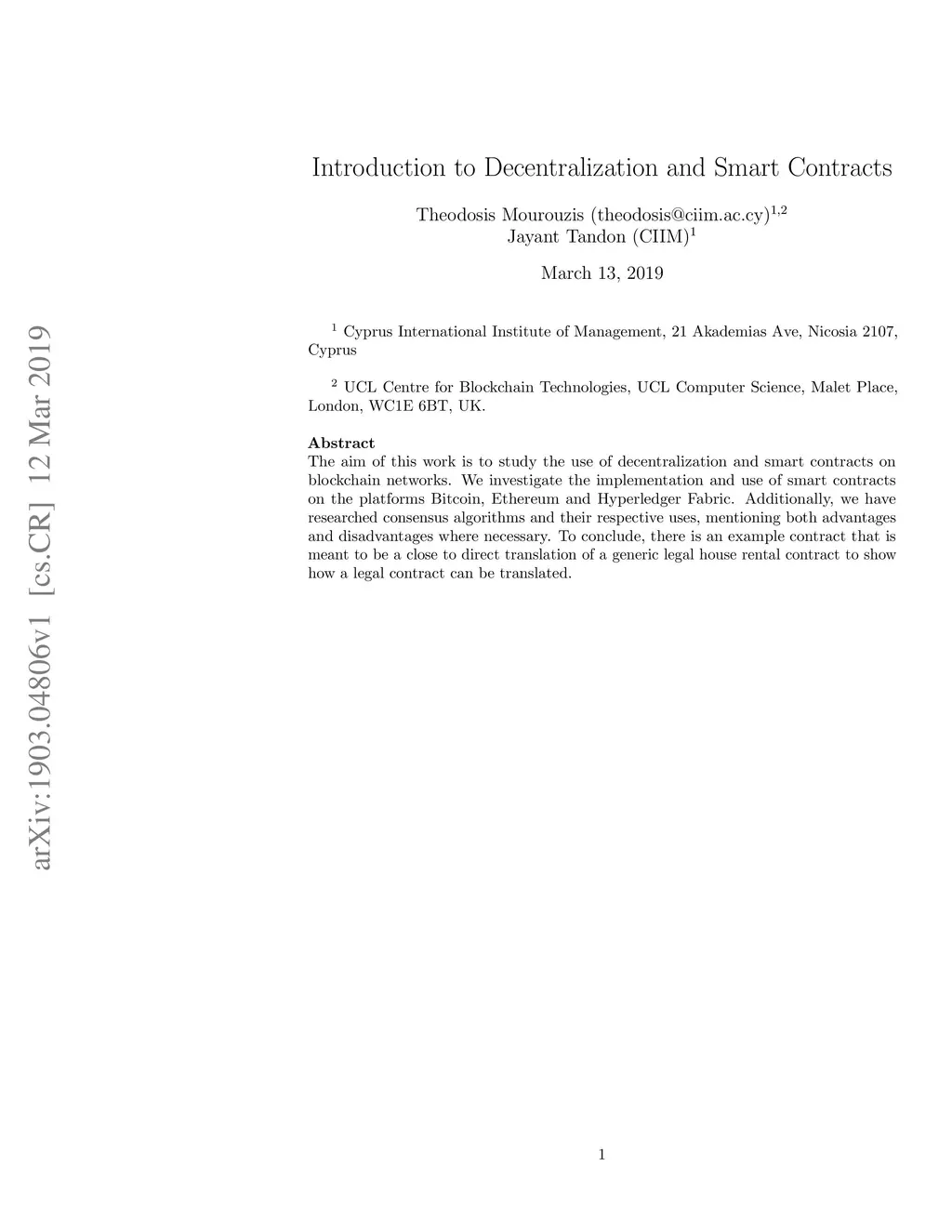 The aim of this work is to study the use of decentralization and smart contracts on blockchain networks. We investigate the implementation and use of smart contracts on the platforms Bitcoin, Ethereum and Hyperledger Fabric. Additionally, we have researched consensus algorithms and their respective uses, mentioning both advantages and disadvantages where necessary. To conclude, there is an example contract that is meant to be a close to direct translation of a generic legal house rental contract to show how a legal contract can be translated.