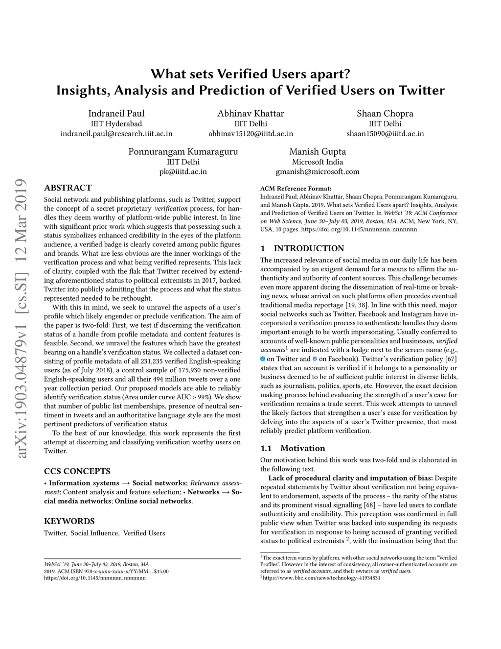 Social network and publishing platforms, such as Twitter, support the concept of a secret proprietary verification process, for handles they deem worthy of platform-wide public interest. In line with significant prior work which suggests that possessing such a status symbolizes enhanced credibility in the eyes of the platform audience, a verified badge is clearly coveted among public figures and brands. What are less obvious are the inner workings of the verification process and what being verified represents. This lack of clarity, coupled with the flak that Twitter received by extending aforementioned status to political extremists in 2017, backed Twitter into publicly admitting that the process and what the status represented needed to be rethought. With this in mind, we seek to unravel the aspects of a user's profile which likely engender or preclude verification. The aim of the paper is two-fold: First, we test if discerning the verification status of a handle from profile metadata and content features is feasible. Second, we unravel the features which have the greatest bearing on a handle's verification status. We collected a dataset consisting of profile metadata of all 231,235 verified English-speaking users (as of July 2018), a control sample of 175,930 non-verified English-speaking users and all their 494 million tweets over a one year collection period. Our proposed models are able to reliably identify verification status (Area under curve AUC > 99%). We show that number of public list memberships, presence of neutral sentiment in tweets and an authoritative language style are the most pertinent predictors of verification status. To the best of our knowledge, this work represents the first attempt at discerning and classifying verification worthy users on Twitter.