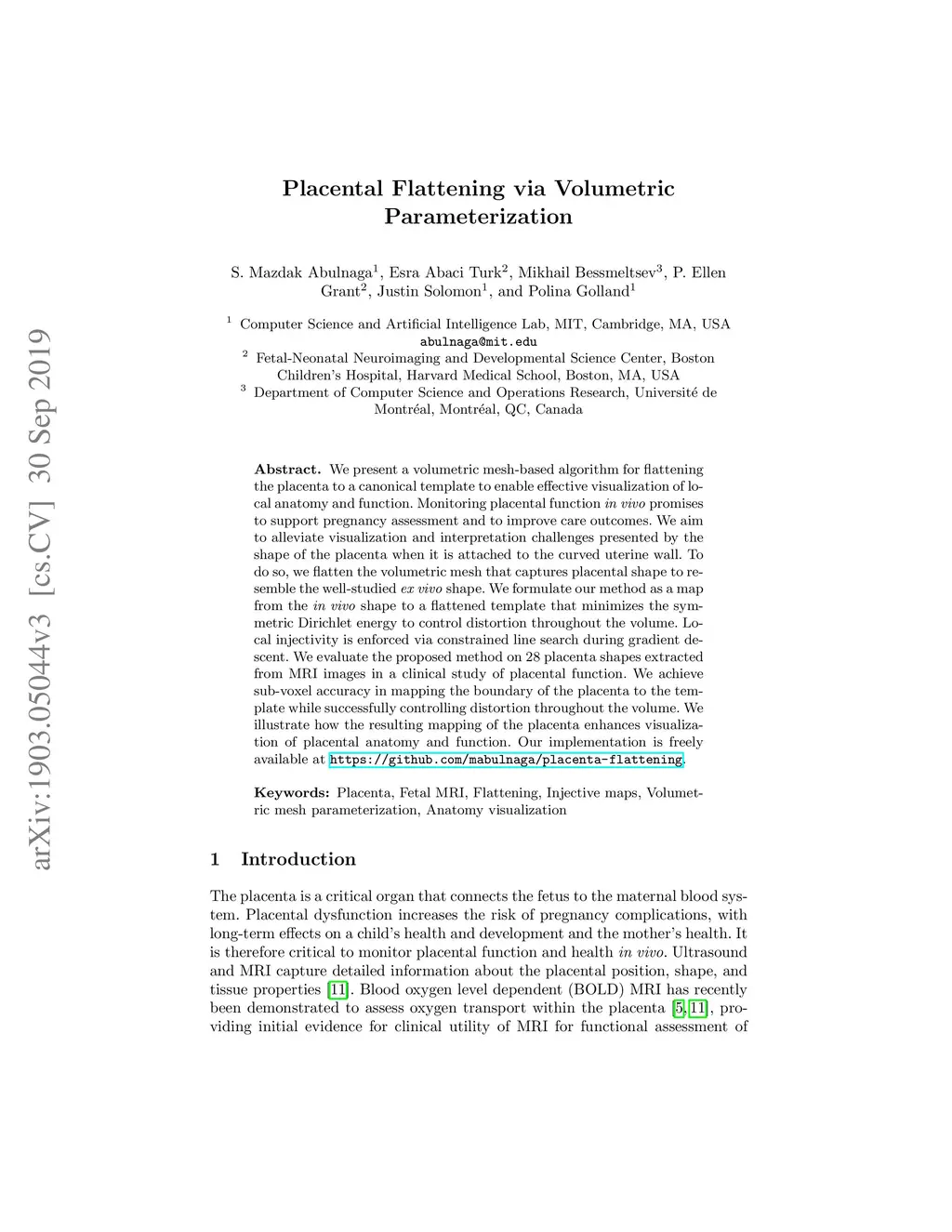 We present a volumetric mesh-based algorithm for flattening the placenta to a canonical template to enable effective visualization of local anatomy and function. Monitoring placental function in vivo promises to support pregnancy assessment and to improve care outcomes. We aim to alleviate visualization and interpretation challenges presented by the shape of the placenta when it is attached to the curved uterine wall. To do so, we flatten the volumetric mesh that captures placental shape to resemble the well-studied ex vivo shape. We formulate our method as a map from the in vivo shape to a flattened template that minimizes the symmetric Dirichlet energy to control distortion throughout the volume. Local injectivity is enforced via constrained line search during gradient descent. We evaluate the proposed method on 28 placenta shapes extracted from MRI images in a clinical study of placental function. We achieve sub-voxel accuracy in mapping the boundary of the placenta to the template while successfully controlling distortion throughout the volume. We illustrate how the resulting mapping of the placenta enhances visualization of placental anatomy and function. Our code is freely available at https://github.com/mabulnaga/placenta-flattening .