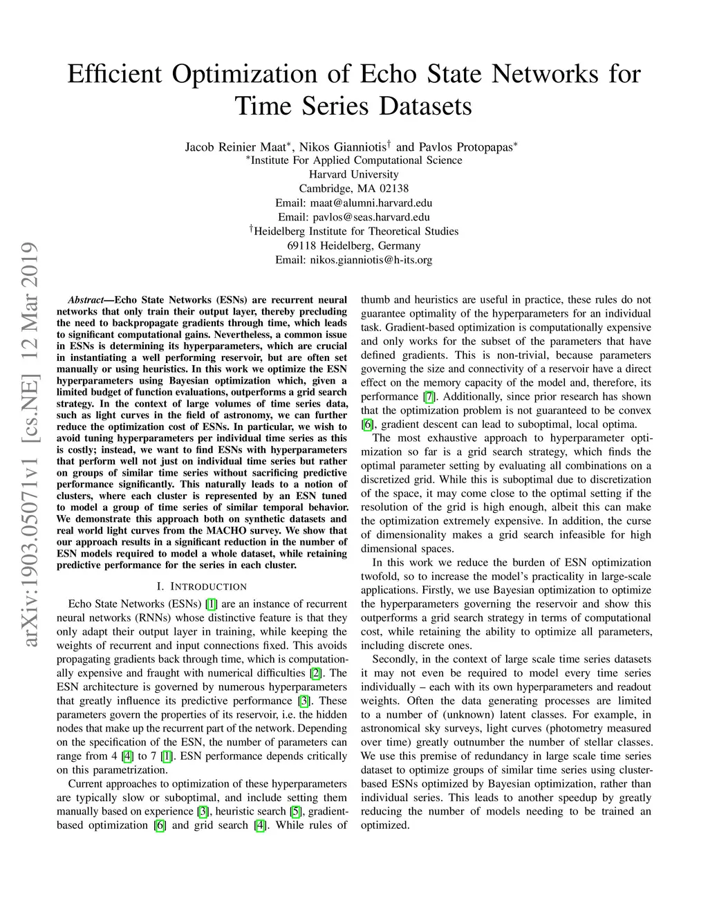 Efficient Optimization of Echo State Networks for Time Series Datasets