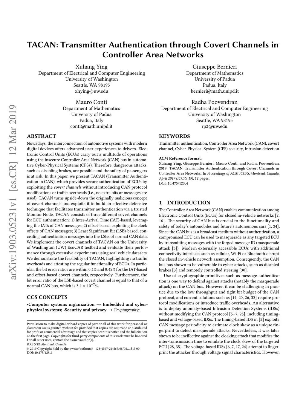Nowadays, the interconnection of automotive systems with modern digital devices offers advanced user experiences to drivers. Electronic Control Units (ECUs) carry out a multitude of operations using the insecure Controller Area Network (CAN) bus in automotive Cyber-Physical Systems (CPSs). Therefore, dangerous attacks, such as disabling brakes, are possible and the safety of passengers is at risk. In this paper, we present TACAN (Transmitter Authentication in CAN), which provides secure authentication of ECUs by exploiting the covert channels without introducing CAN protocol modifications or traffic overheads (i.e., no extra bits or messages are used). TACAN turns upside-down the originally malicious concept of covert channels and exploits it to build an effective defensive technique that facilitates transmitter authentication via a trusted Monitor Node. TACAN consists of three different covert channels for ECU authentication: 1) Inter-Arrival Time (IAT)-based, leveraging the IATs of CAN messages; 2) offset-based, exploiting the clock offsets of CAN messages; 3) Least Significant Bit (LSB)-based, concealing authentication messages into the LSBs of normal CAN data. We implement the covert channels on the University of Washington (UW) EcoCAR testbed and evaluate their performance through extensive experiments. We demonstrate the feasibility of TACAN, highlighting no traffic overheads and attesting the regular functionality of ECUs. In particular, the bit error ratios are within 0.1% and 0.42% for the IAT-based and offset-based covert channels, respectively. Furthermore, the bit error ratio of the LSB-based covert channel is equal to that of a normal CAN bus, which is 3.1x10^-7%.