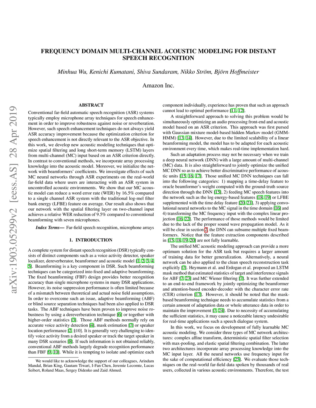 Frequency Domain Multi-channel Acoustic Modeling for Distant Speech
