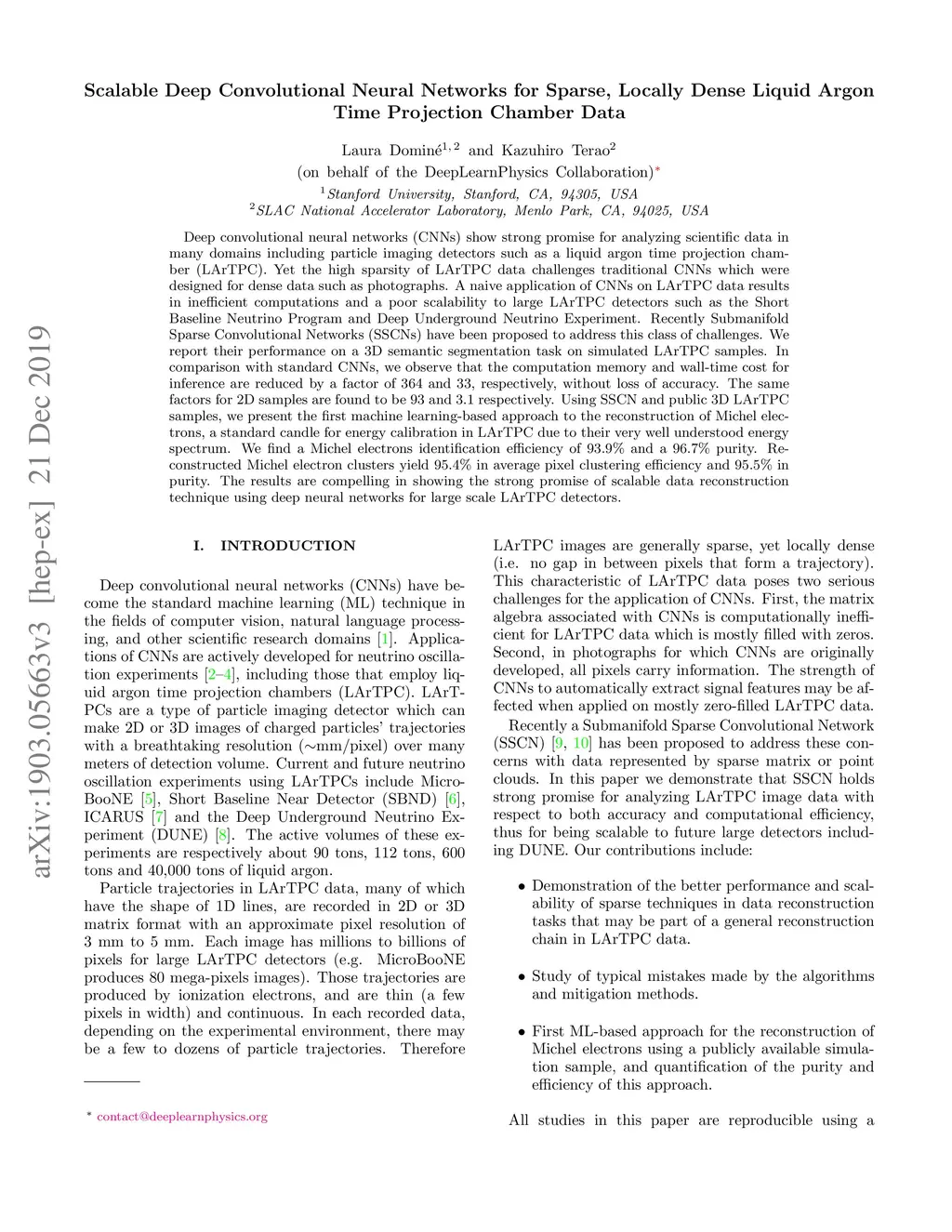 Deep convolutional neural networks (CNNs) show strong promise for analyzing scientific data in many domains including particle imaging detectors such as a liquid argon time projection chamber (LArTPC). Yet the high sparsity of LArTPC data challenges traditional CNNs which were designed for dense data such as photographs. A naive application of CNNs on LArTPC data results in inefficient computations and a poor scalability to large LArTPC detectors such as the Short Baseline Neutrino Program and Deep Underground Neutrino Experiment. Recently Submanifold Sparse Convolutional Networks (SSCNs) have been proposed to address this challenge. We report their performance on a 3D semantic segmentation task on simulated LArTPC samples. In comparison with standard CNNs, we observe that the computation memory and wall-time cost for inference are reduced by factor of 364 and 33 respectively without loss of accuracy. The same factors for 2D samples are found to be 93 and 3.1 respectively. Using SSCN, we present the first machine learning-based approach to the reconstruction of Michel electrons using public 3D LArTPC samples. We find a Michel electron identification efficiency of 93.9% with 96.7% of true positive rate. Reconstructed Michel electron clusters yield 95.4% in average pixel clustering efficiency and 95.5% in purity. The results are compelling to show strong promise of scalable data reconstruction technique using deep neural networks for large scale LArTPC detectors.