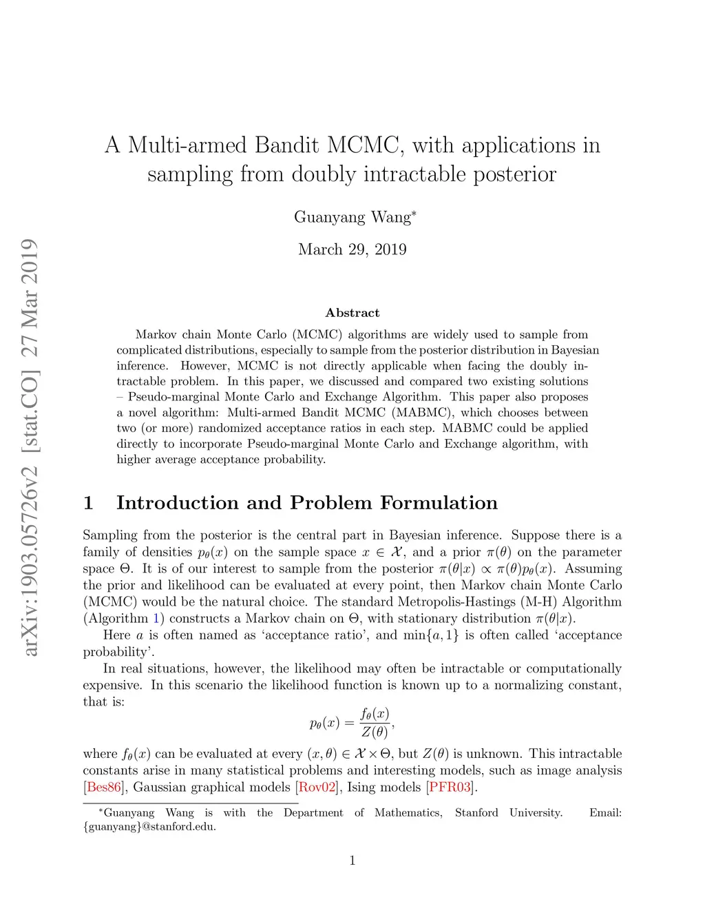 Markov chain Monte Carlo (MCMC) algorithms are widely used to sample from complicated distributions, especially to sample from the posterior distribution in Bayesian inference. However, MCMC is not directly applicable when facing the doubly intractable problem. In this paper, we discussed and compared two existing solutions -- Pseudo-marginal Monte Carlo and Exchange Algorithm. This paper also proposes a novel algorithm: Multi-armed Bandit MCMC (MABMC), which chooses between two (or more) randomized acceptance ratios in each step. MABMC could be applied directly to incorporate Pseudo-marginal Monte Carlo and Exchange algorithm, with higher average acceptance probability.