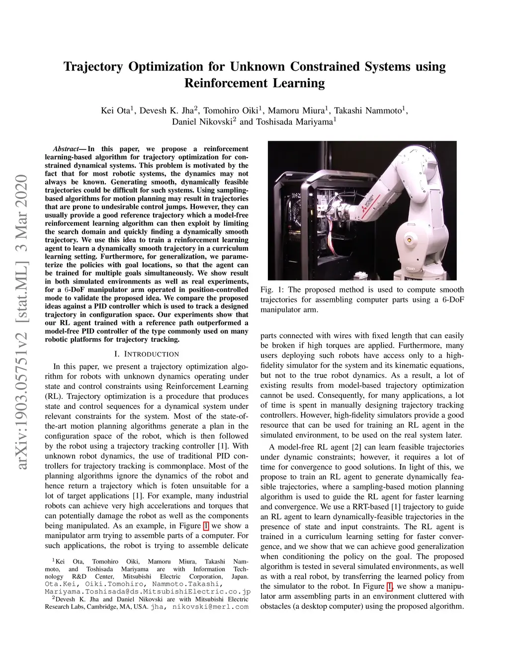 In this paper, we propose a reinforcement learning-based algorithm for trajectory optimization for constrained dynamical systems. This problem is motivated by the fact that for most robotic systems, the dynamics may not always be known. Generating smooth, dynamically feasible trajectories could be difficult for such systems. Using sampling-based algorithms for motion planning may result in trajectories that are prone to undesirable control jumps. However, they can usually provide a good reference trajectory which a model-free reinforcement learning algorithm can then exploit by limiting the search domain and quickly finding a dynamically smooth trajectory. We use this idea to train a reinforcement learning agent to learn a dynamically smooth trajectory in a curriculum learning setting. Furthermore, for generalization, we parameterize the policies with goal locations, so that the agent can be trained for multiple goals simultaneously. We show result in both simulated environments as well as real experiments, for a -DoF manipulator arm operated in position-controlled mode to validate the proposed idea. We compare the proposed ideas against a PID controller which is used to track a designed trajectory in configuration space. Our experiments show that our RL agent trained with a reference path outperformed a model-free PID controller of the type commonly used on many robotic platforms for trajectory tracking.