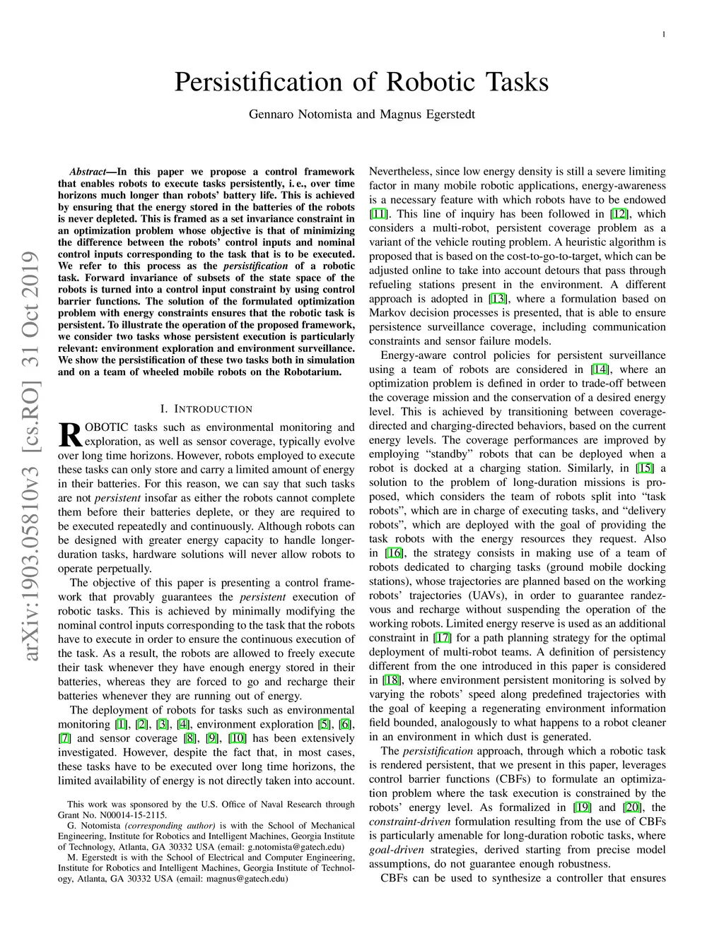 In this paper we propose a control framework that enables robots to execute tasks persistently, i.e., over time horizons much longer than robots' battery life. This is achieved by ensuring that the energy stored in the batteries of the robots is never depleted. This is framed as a set invariance constraint in an optimization problem whose objective is that of minimizing the difference between the robots' control inputs and nominal control inputs corresponding to the task that is to be executed. We refer to this process as the persistification of a robotic task. Forward invariance of subsets of the state space of the robots is turned into a control input constraint by using control barrier functions. The solution of the formulated optimization problem with energy constraints ensures that the robotic task is persistent. To illustrate the operation of the proposed framework, we consider two tasks whose persistent execution is particularly relevant: environment exploration and environment surveillance. We show the persistification of these two tasks both in simulation and on a team of wheeled mobile robots on the Robotarium.