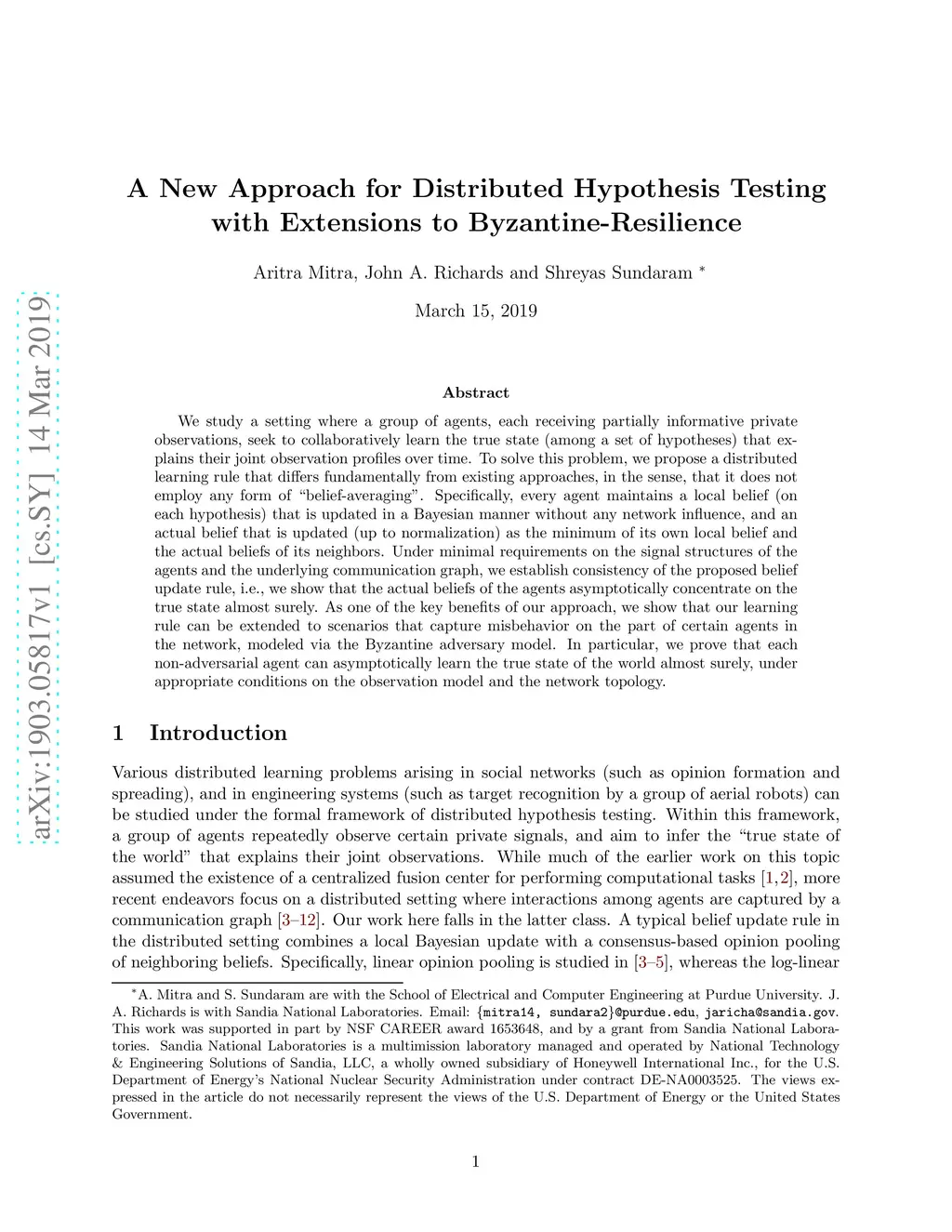 We study a setting where a group of agents, each receiving partially informative private observations, seek to collaboratively learn the true state (among a set of hypotheses) that explains their joint observation profiles over time. To solve this problem, we propose a distributed learning rule that differs fundamentally from existing approaches, in the sense, that it does not employ any form of "belief-averaging". Specifically, every agent maintains a local belief (on each hypothesis) that is updated in a Bayesian manner without any network influence, and an actual belief that is updated (up to normalization) as the minimum of its own local belief and the actual beliefs of its neighbors. Under minimal requirements on the signal structures of the agents and the underlying communication graph, we establish consistency of the proposed belief update rule, i.e., we show that the actual beliefs of the agents asymptotically concentrate on the true state almost surely. As one of the key benefits of our approach, we show that our learning rule can be extended to scenarios that capture misbehavior on the part of certain agents in the network, modeled via the Byzantine adversary model. In particular, we prove that each non-adversarial agent can asymptotically learn the true state of the world almost surely, under appropriate conditions on the observation model and the network topology.