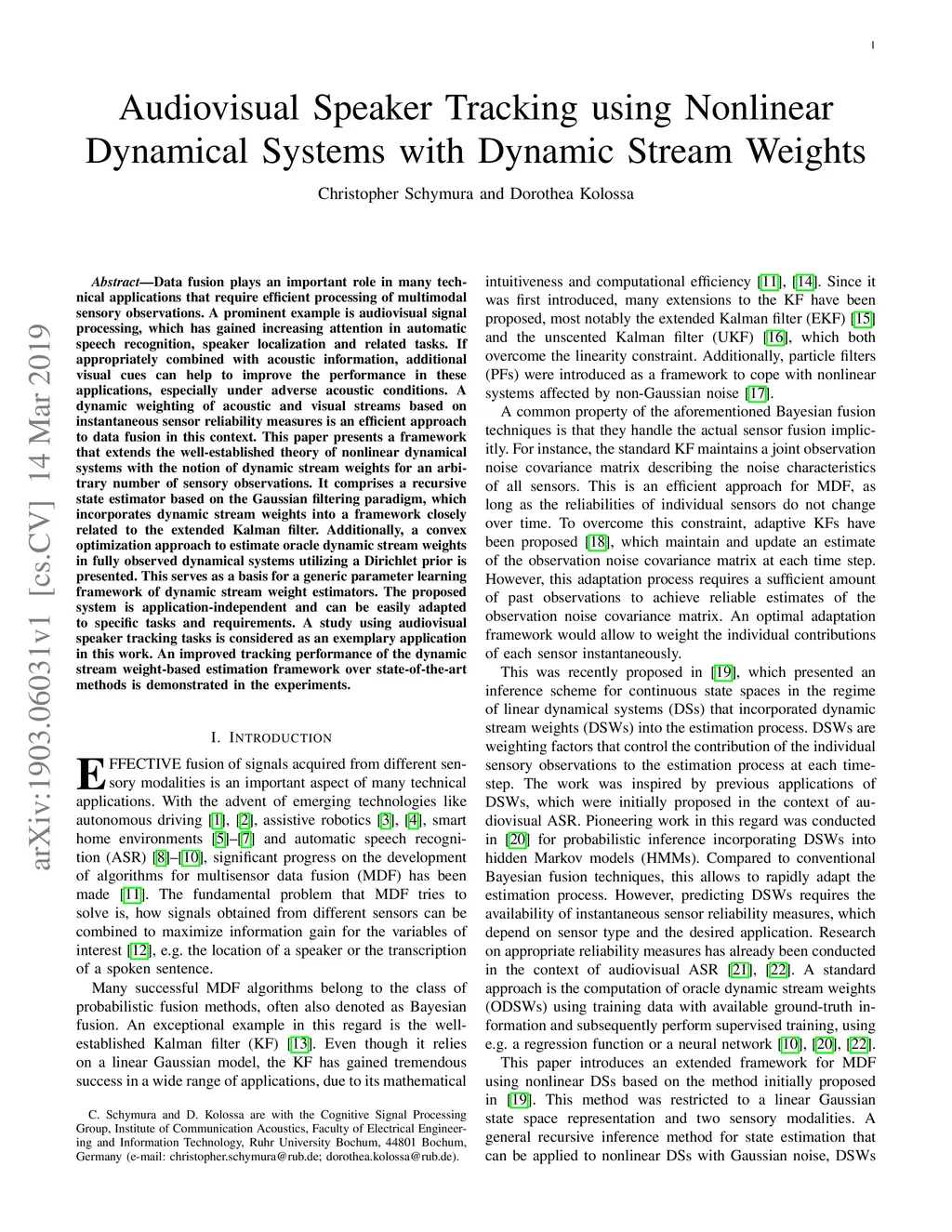Data fusion plays an important role in many technical applications that require efficient processing of multimodal sensory observations. A prominent example is audiovisual signal processing, which has gained increasing attention in automatic speech recognition, speaker localization and related tasks. If appropriately combined with acoustic information, additional visual cues can help to improve the performance in these applications, especially under adverse acoustic conditions. A dynamic weighting of acoustic and visual streams based on instantaneous sensor reliability measures is an efficient approach to data fusion in this context. This paper presents a framework that extends the well-established theory of nonlinear dynamical systems with the notion of dynamic stream weights for an arbitrary number of sensory observations. It comprises a recursive state estimator based on the Gaussian filtering paradigm, which incorporates dynamic stream weights into a framework closely related to the extended Kalman filter. Additionally, a convex optimization approach to estimate oracle dynamic stream weights in fully observed dynamical systems utilizing a Dirichlet prior is presented. This serves as a basis for a generic parameter learning framework of dynamic stream weight estimators. The proposed system is application-independent and can be easily adapted to specific tasks and requirements. A study using audiovisual speaker tracking tasks is considered as an exemplary application in this work. An improved tracking performance of the dynamic stream weight-based estimation framework over state-of-the-art methods is demonstrated in the experiments.