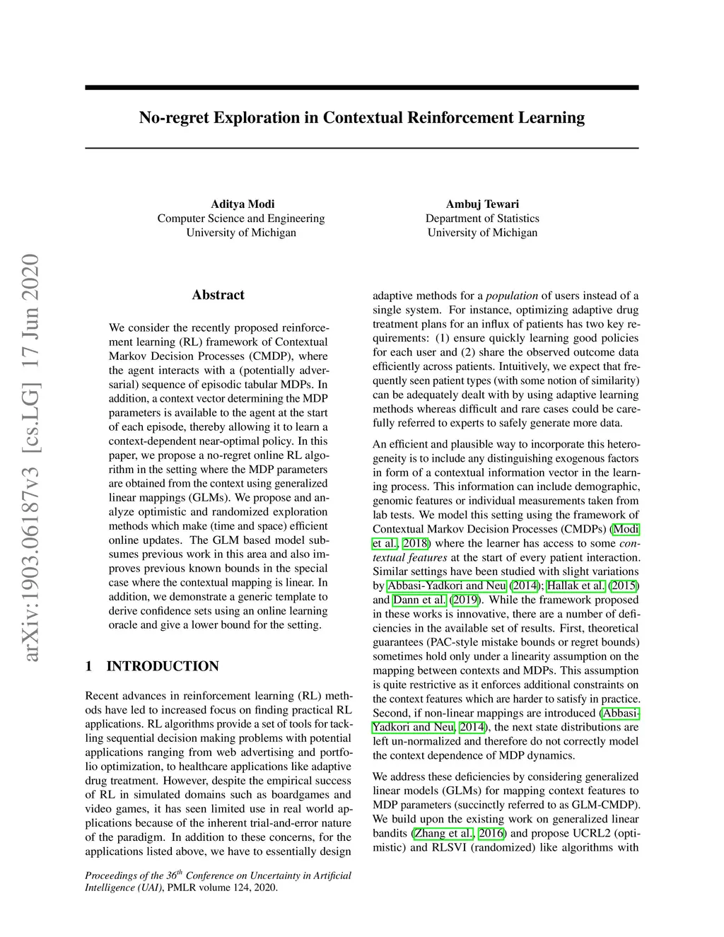 Contextual Markov Decision Processes using Generalized Linear Models