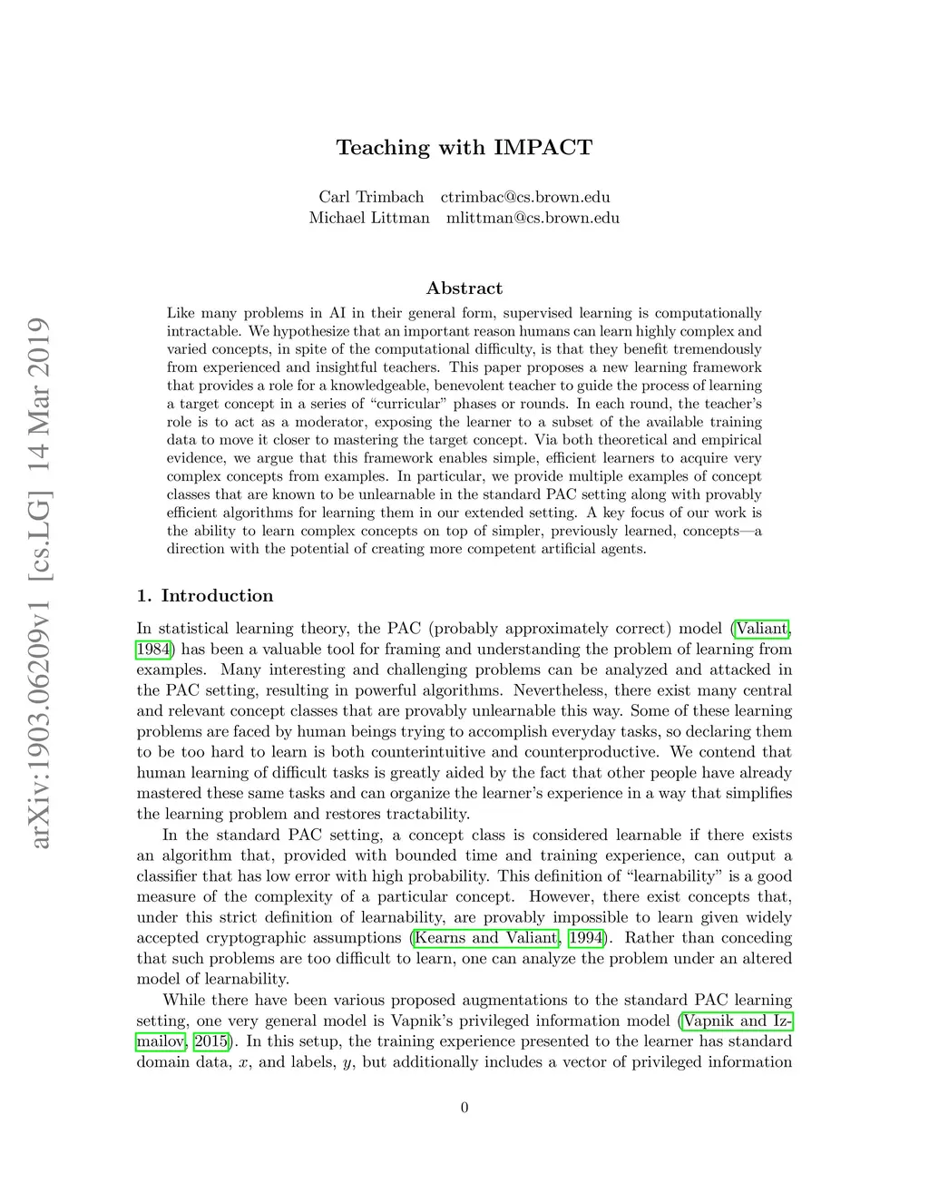 Like many problems in AI in their general form, supervised learning is computationally intractable. We hypothesize that an important reason humans can learn highly complex and varied concepts, in spite of the computational difficulty, is that they benefit tremendously from experienced and insightful teachers. This paper proposes a new learning framework that provides a role for a knowledgeable, benevolent teacher to guide the process of learning a target concept in a series of "curricular" phases or rounds. In each round, the teacher's role is to act as a moderator, exposing the learner to a subset of the available training data to move it closer to mastering the target concept. Via both theoretical and empirical evidence, we argue that this framework enables simple, efficient learners to acquire very complex concepts from examples. In particular, we provide multiple examples of concept classes that are known to be unlearnable in the standard PAC setting along with provably efficient algorithms for learning them in our extended setting. A key focus of our work is the ability to learn complex concepts on top of simpler, previously learned, concepts---a direction with the potential of creating more competent artificial agents.