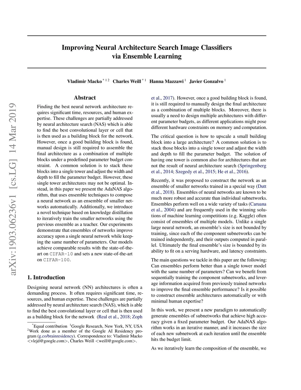 Improving Neural Architecture Search Image Classifiers via Ensemble