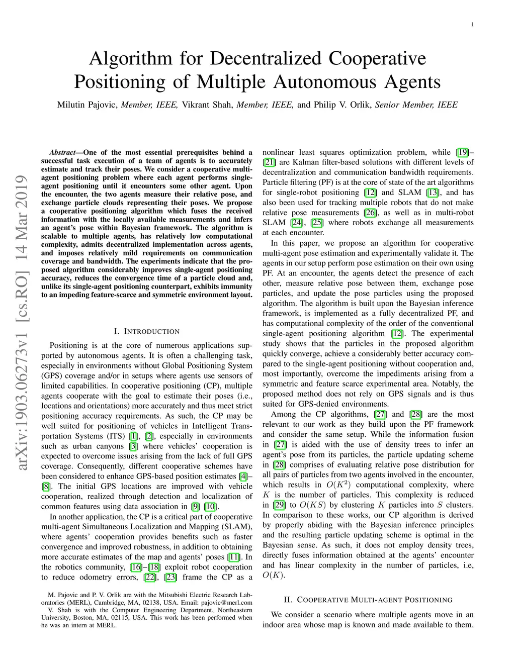 One of the most essential prerequisites behind a successful task execution of a team of agents is to accurately estimate and track their poses. We consider a cooperative multi-agent positioning problem where each agent performs single-agent positioning until it encounters some other agent. Upon the encounter, the two agents measure their relative pose, and exchange particle clouds representing their poses. We propose a cooperative positioning algorithm which fuses the received information with the locally available measurements and infers an agent's pose within Bayesian framework. The algorithm is scalable to multiple agents, has relatively low computational complexity, admits decentralized implementation across agents, and imposes relatively mild requirements on communication coverage and bandwidth. The experiments indicate that the proposed algorithm considerably improves single-agent positioning accuracy, reduces the convergence time of a particle cloud and, unlike its single-agent positioning counterpart, exhibits immunity to an impeding feature-scarce and symmetric environment layout.