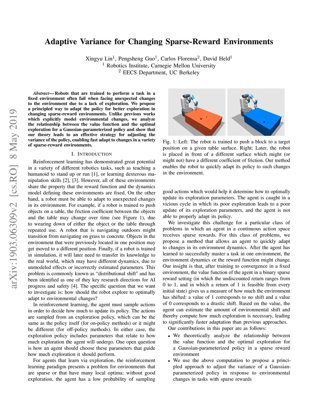 Robots that are trained to perform a task in a fixed environment often fail when facing unexpected changes to the environment due to a lack of exploration. We propose a principled way to adapt the policy for better exploration in changing sparse-reward environments. Unlike previous works which explicitly model environmental changes, we analyze the relationship between the value function and the optimal exploration for a Gaussian-parameterized policy and show that our theory leads to an effective strategy for adjusting the variance of the policy, enabling fast adapt to changes in a variety of sparse-reward environments.