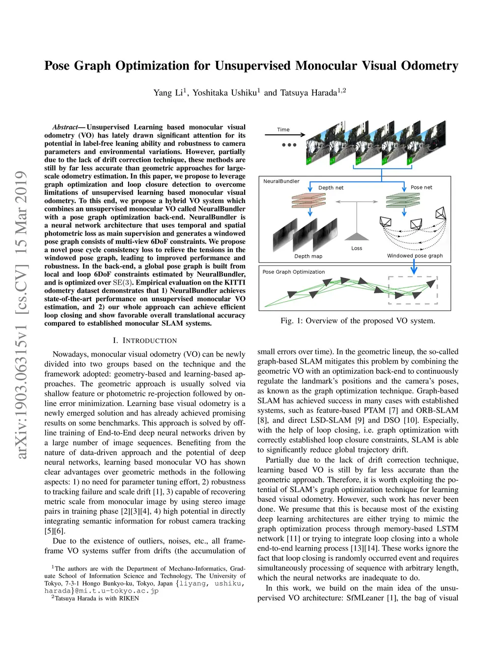Unsupervised Learning based monocular visual odometry (VO) has lately drawn significant attention for its potential in label-free leaning ability and robustness to camera parameters and environmental variations. However, partially due to the lack of drift correction technique, these methods are still by far less accurate than geometric approaches for large-scale odometry estimation. In this paper, we propose to leverage graph optimization and loop closure detection to overcome limitations of unsupervised learning based monocular visual odometry. To this end, we propose a hybrid VO system which combines an unsupervised monocular VO called NeuralBundler with a pose graph optimization back-end. NeuralBundler is a neural network architecture that uses temporal and spatial photometric loss as main supervision and generates a windowed pose graph consists of multi-view 6DoF constraints. We propose a novel pose cycle consistency loss to relieve the tensions in the windowed pose graph, leading to improved performance and robustness. In the back-end, a global pose graph is built from local and loop 6DoF constraints estimated by NeuralBundler and is optimized over SE(3). Empirical evaluation on the KITTI odometry dataset demonstrates that 1) NeuralBundler achieves state-of-the-art performance on unsupervised monocular VO estimation, and 2) our whole approach can achieve efficient loop closing and show favorable overall translational accuracy compared to established monocular SLAM systems.