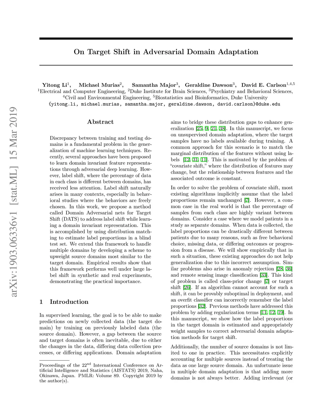 Discrepancy between training and testing domains is a fundamental problem in the generalization of machine learning techniques. Recently, several approaches have been proposed to learn domain invariant feature representations through adversarial deep learning. However, label shift, where the percentage of data in each class is different between domains, has received less attention. Label shift naturally arises in many contexts, especially in behavioral studies where the behaviors are freely chosen. In this work, we propose a method called Domain Adversarial nets for Target Shift (DATS) to address label shift while learning a domain invariant representation. This is accomplished by using distribution matching to estimate label proportions in a blind test set. We extend this framework to handle multiple domains by developing a scheme to upweight source domains most similar to the target domain. Empirical results show that this framework performs well under large label shift in synthetic and real experiments, demonstrating the practical importance.