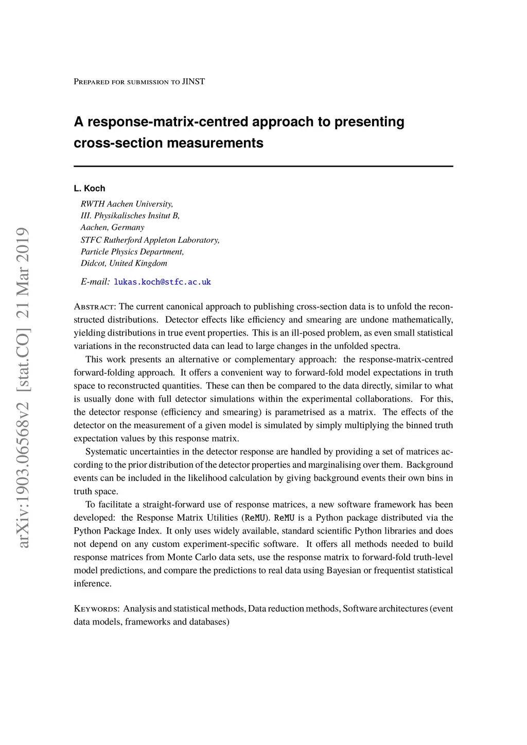 The current canonical approach to publishing cross-section data is to unfold the reconstructed distributions. Detector effects like efficiency and smearing are undone mathematically, yielding distributions in true event properties. This is an ill-posed problem, as even small statistical variations in the reconstructed data can lead to large changes in the unfolded spectra. This work presents an alternative or complementary approach: the response-matrix-centred forward-folding approach. It offers a convenient way to forward-fold model expectations in truth space to reconstructed quantities. These can then be compared to the data directly, similar to what is usually done with full detector simulations within the experimental collaborations. For this, the detector response (efficiency and smearing) is parametrised as a matrix. The effects of the detector on the measurement of a given model is simulated by simply multiplying the binned truth expectation values by this response matrix. Systematic uncertainties in the detector response are handled by providing a set of matrices according to the prior distribution of the detector properties and marginalising over them. Background events can be included in the likelihood calculation by giving background events their own bins in truth space. To facilitate a straight-forward use of response matrices, a new software framework has been developed: the Response Matrix Utilities (ReMU). ReMU is a Python package distributed via the Python Package Index. It only uses widely available, standard scientific Python libraries and does not depend on any custom experiment-specific software. It offers all methods needed to build response matrices from Monte Carlo data sets, use the response matrix to forward-fold truth-level model predictions, and compare the predictions to real data using Bayesian or frequentist statistical inference.