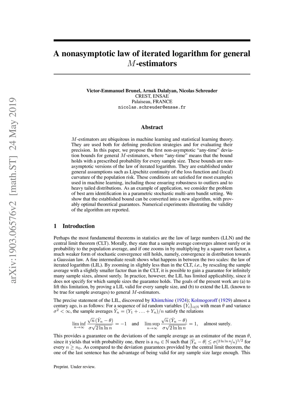 M-estimators are ubiquitous in machine learning and statistical learning theory. They are used both for defining prediction strategies and for evaluating their precision. In this paper, we propose the first non-asymptotic "any-time" deviation bounds for general M-estimators, where "any-time" means that the bound holds with a prescribed probability for every sample size. These bounds are nonasymptotic versions of the law of iterated logarithm. They are established under general assumptions such as Lipschitz continuity of the loss function and (local) curvature of the population risk. These conditions are satisfied for most examples used in machine learning, including those ensuring robustness to outliers and to heavy tailed distributions. As an example of application, we consider the problem of best arm identification in a parametric stochastic multi-arm bandit setting. We show that the established bound can be converted into a new algorithm, with provably optimal theoretical guarantees. Numerical experiments illustrating the validity of the algorithm are reported.