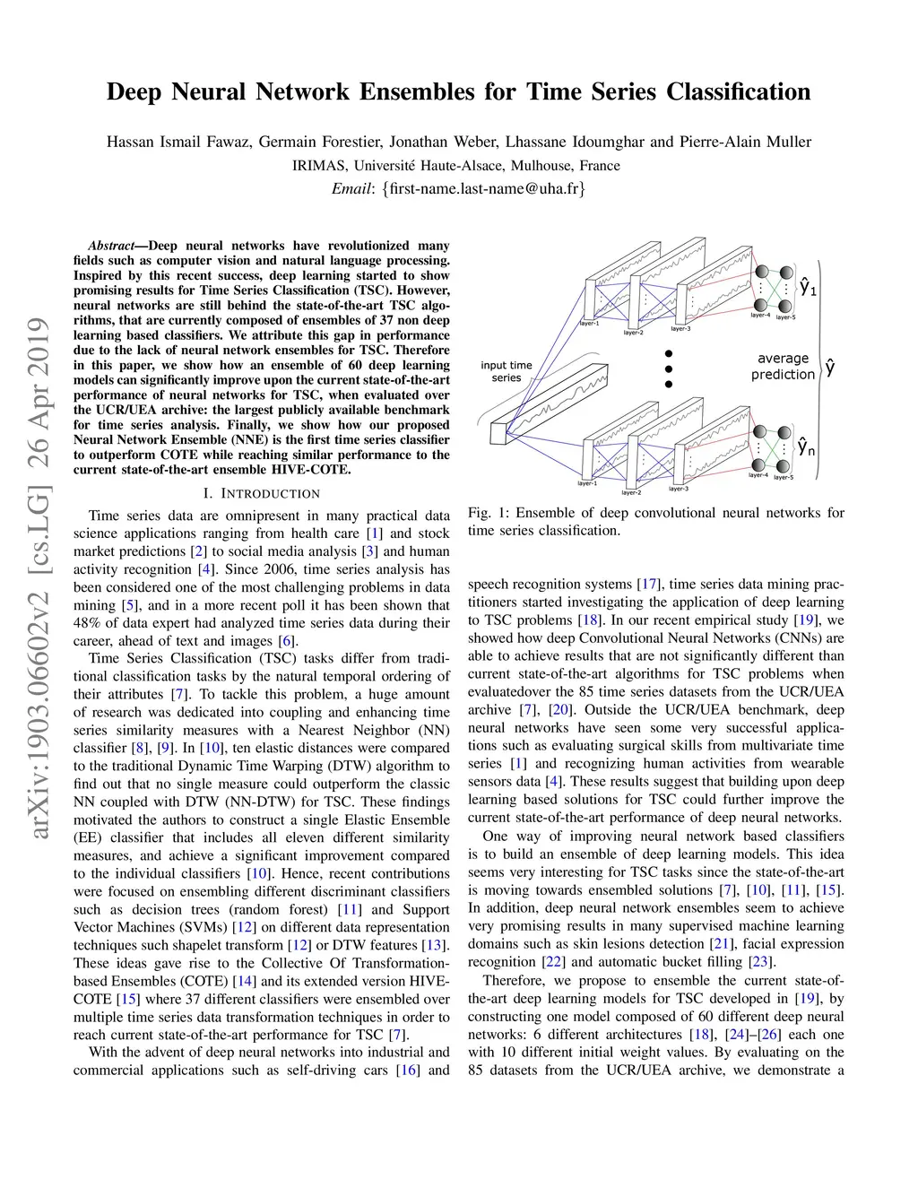 Deep neural networks have revolutionized many fields such as computer vision and natural language processing. Inspired by this recent success, deep learning started to show promising results for Time Series Classification (TSC). However, neural networks are still behind the state-of-the-art TSC algorithms, that are currently composed of ensembles of 37 non deep learning based classifiers. We attribute this gap in performance due to the lack of neural network ensembles for TSC. Therefore in this paper, we show how an ensemble of 60 deep learning models can significantly improve upon the current state-of-the-art performance of neural networks for TSC, when evaluated over the UCR/UEA archive: the largest publicly available benchmark for time series analysis. Finally, we show how our proposed Neural Network Ensemble (NNE) is the first time series classifier to outperform COTE while reaching similar performance to the current state-of-the-art ensemble HIVE-COTE.