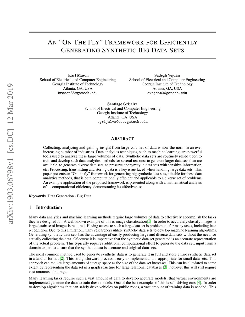 An "On The Fly" Framework for Efficiently Generating Synthetic Big Data