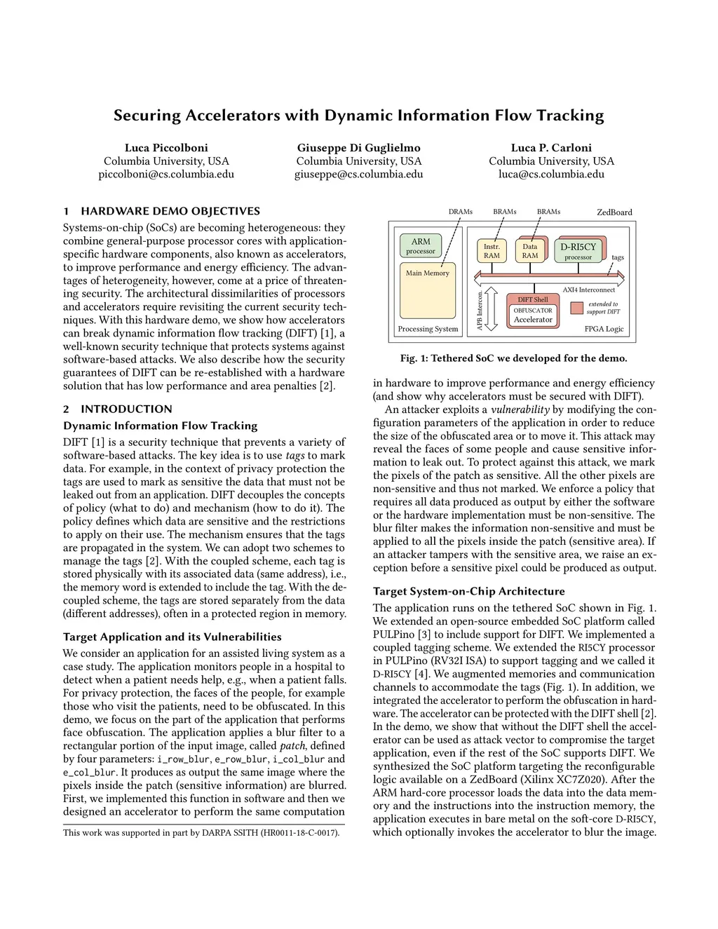 Systems-on-chip (SoCs) are becoming heterogeneous: they combine general-purpose processor cores with application-specific hardware components, also known as accelerators, to improve performance and energy efficiency. The advantages of heterogeneity, however, come at a price of threatening security. The architectural dissimilarities of processors and accelerators require revisiting the current security techniques. With this hardware demo, we show how accelerators can break dynamic information flow tracking (DIFT), a well-known security technique that protects systems against software-based attacks. We also describe how the security guarantees of DIFT can be re-established with a hardware solution that has low performance and area penalties.