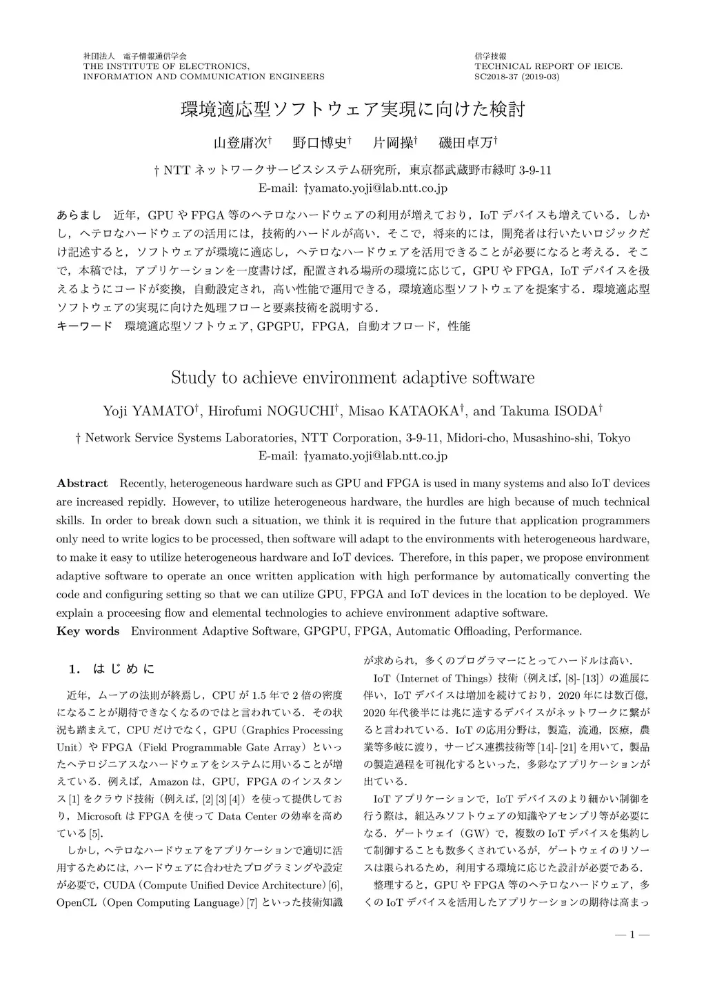 Recently, heterogeneous hardware such as GPU and FPGA is used in many systems and also IoT devices are increased repidly. However, to utilize heterogeneous hardware, the hurdles are high because of much technical skills. In order to break down such a situation, we think it is required in the future that application programmers only need to write logics to be processed, then software will adapt to the environments with heterogeneous hardware, to make it easy to utilize heterogeneous hardware and IoT devices. Therefore, in this paper, we propose environment adaptive software to operate an once written application with high performance by automatically converting the code and configuring setting so that we can utilize GPU, FPGA and IoT devices in the location to be deployed. We explain a proceesing flow and elemental technologies to achieve environment adaptive software.