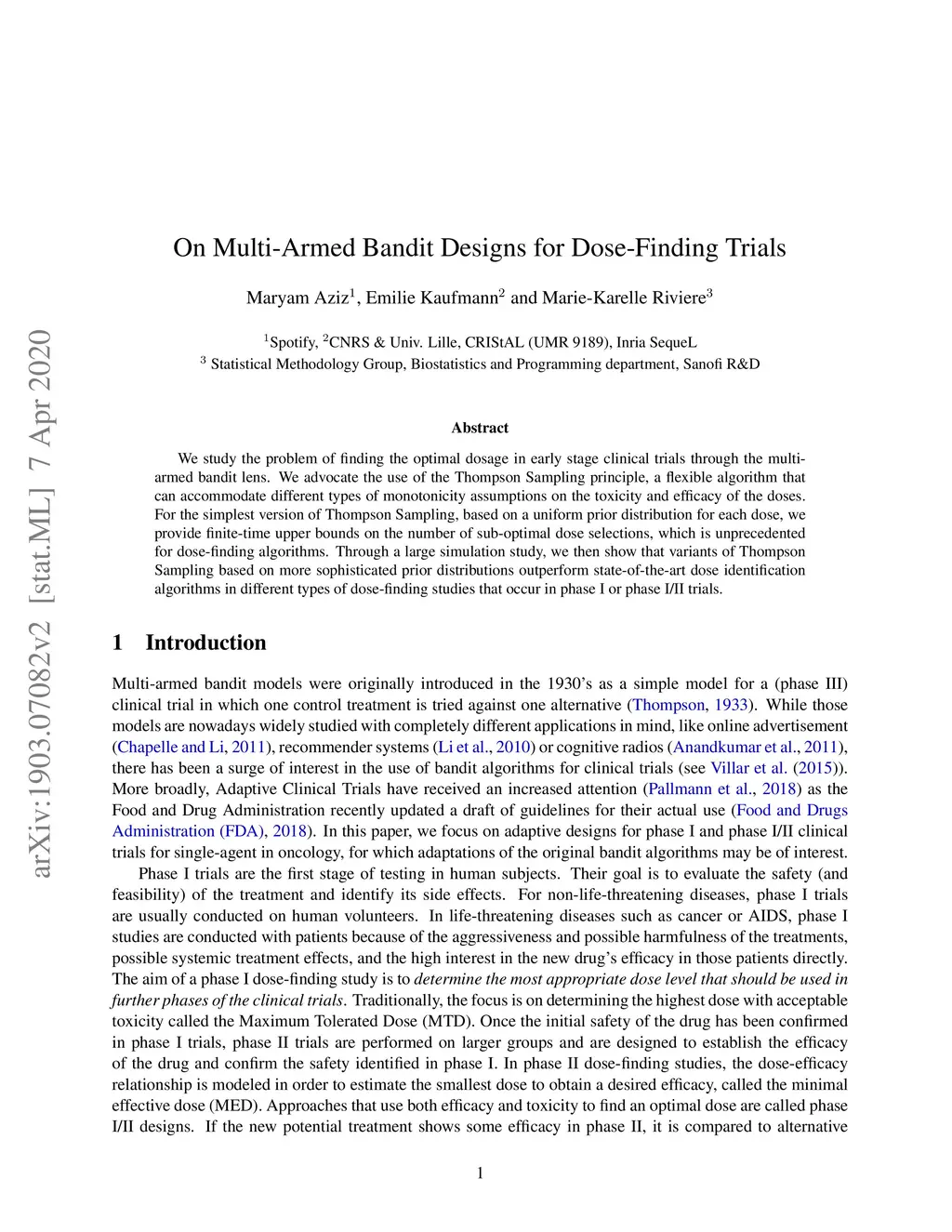We study the problem of finding the optimal dosage in early stage clinical trials through the multi-armed bandit lens. We advocate the use of the Thompson Sampling principle, a flexible algorithm that can accommodate different types of monotonicity assumptions on the toxicity and efficacy of the doses. For the simplest version of Thompson Sampling, based on a uniform prior distribution for each dose, we provide finite-time upper bounds on the number of sub-optimal dose selections, which is unprecedented for dose-finding algorithms. Through a large simulation study, we then show that variants of Thompson Sampling based on more sophisticated prior distributions outperform state-of-the-art dose identification algorithms in different types of dose-finding studies that occur in phase I or phase I/II trials.
