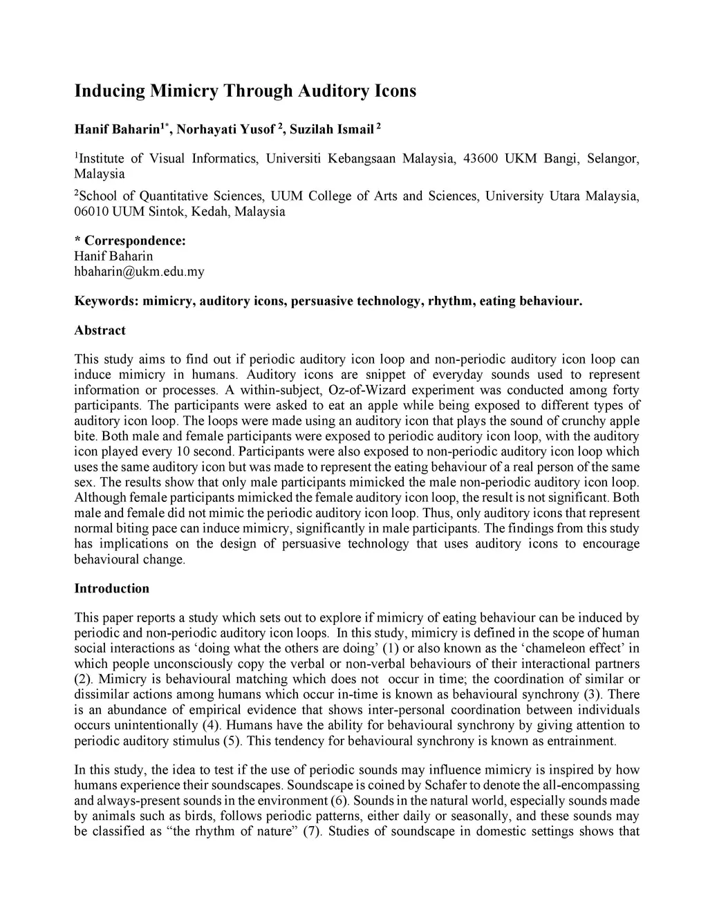 This study aims to find out if periodic auditory icon loop and non-periodic auditory icon loop can induce mimicry in humans. Auditory icons are snippet of everyday sounds used to represent information or processes. A within-subject, Oz-of-Wizard experiment was conducted among forty participants. The participants were asked to eat an apple while being exposed to different types of auditory icon loop. The loops were made using an auditory icon that plays the sound of crunchy apple bite. Both male and female participants were exposed to periodic auditory icon loop, with the auditory icon played every 10 second. Participants were also exposed to non-periodic auditory icon loop which uses the same auditory icon but was made to represent the eating behaviour of a real person of the same sex. The results show that only male participants mimicked the male non-periodic auditory icon loop. Although female participants mimicked the female auditory icon loop, the result is not significant. Both male and female did not mimic the periodic auditory icon loop. Thus, only auditory icons that represent normal biting pace can induce mimicry, significantly in male participants. The findings from this study has implications on the design of persuasive technology that uses auditory icons to encourage behavioural change.