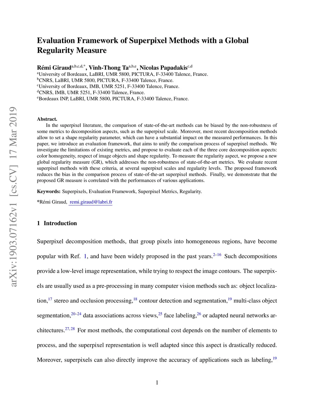 In the superpixel literature, the comparison of state-of-the-art methods can be biased by the non-robustness of some metrics to decomposition aspects, such as the superpixel scale. Moreover, most recent decomposition methods allow to set a shape regularity parameter, which can have a substantial impact on the measured performances. In this paper, we introduce an evaluation framework, that aims to unify the comparison process of superpixel methods. We investigate the limitations of existing metrics, and propose to evaluate each of the three core decomposition aspects: color homogeneity, respect of image objects and shape regularity. To measure the regularity aspect, we propose a new global regularity measure (GR), which addresses the non-robustness of state-of-the-art metrics. We evaluate recent superpixel methods with these criteria, at several superpixel scales and regularity levels. The proposed framework reduces the bias in the comparison process of state-of-the-art superpixel methods. Finally, we demonstrate that the proposed GR measure is correlated with the performances of various applications.
