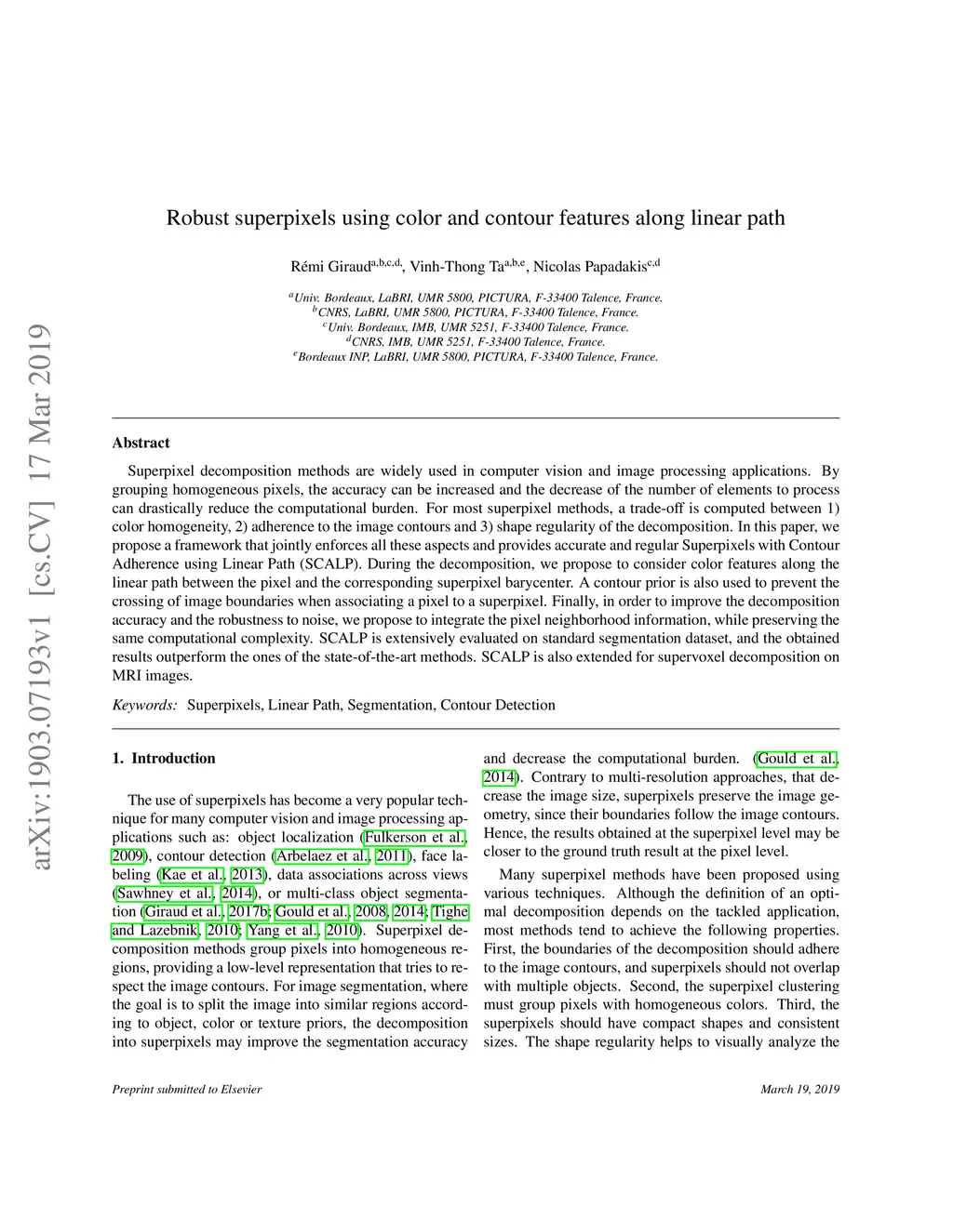 Robust superpixels using color and contour features along linear path