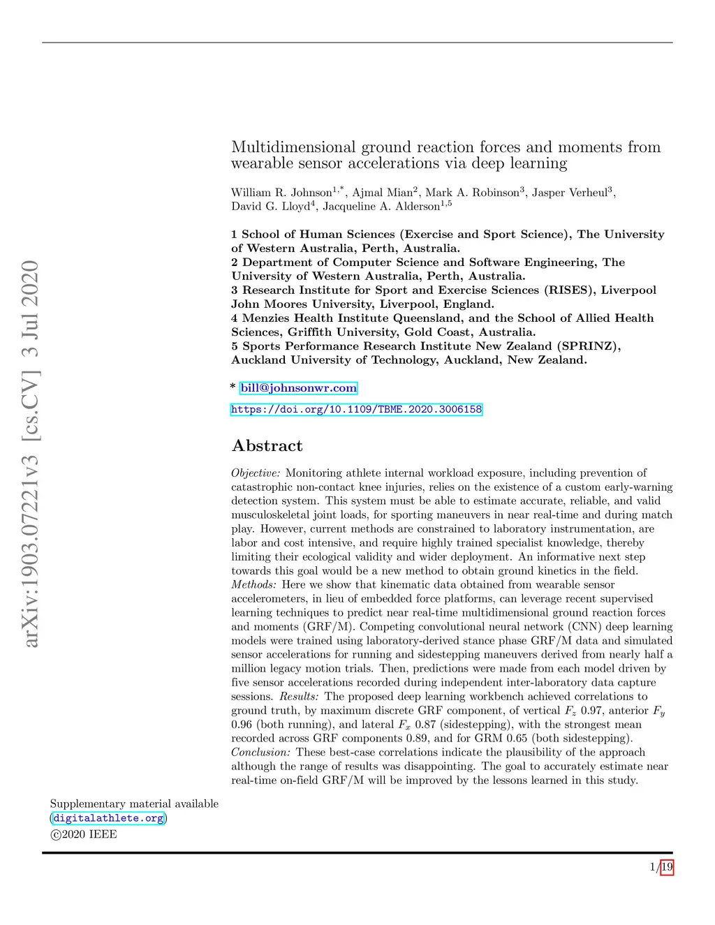 Objective: Monitoring athlete internal workload exposure, including prevention of catastrophic non-contact knee injuries, relies on the existence of a custom early-warning detection system. This system must be able to estimate accurate, reliable, and valid musculoskeletal joint loads, for sporting maneuvers in near real-time and during match play. However, current methods are constrained to laboratory instrumentation, are labor and cost intensive, and require highly trained specialist knowledge, thereby limiting their ecological validity and volume deployment. Methods: Here we show that kinematic data obtained from wearable sensor accelerometers, in lieu of embedded force platforms, can leverage recent supervised learning techniques to predict in-game near real-time multidimensional ground reaction forces and moments (GRF/M). Competing convolutional neural network (CNN) deep learning models were trained using laboratory-derived stance phase GRF/M data and simulated sensor accelerations for running and sidestepping maneuvers derived from nearly half a million legacy motion trials. Then, predictions were made from each model driven by five sensor accelerations recorded during independent inter-laboratory data capture sessions. Results: Despite adversarial conditions, the proposed deep learning workbench achieved correlations for vertical GRF above 0.96 for running. Conclusion: The lessons learned from this study will facilitate the use of wearable sensors in conjunction with deep learning to accurately estimate near real-time on-field GRF/M. Significance: Coaching, medical, and allied health staff can use this technology to monitor a range of joint loading indicators during game play, with the ultimate aim to minimize the occurrence of non-contact injuries in elite and community-level sports.