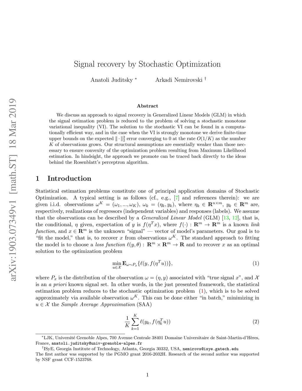 Signal recovery by Stochastic Optimization