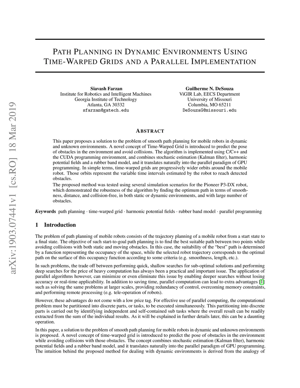 This paper proposes a solution to the problem of smooth path planning for mobile robots in dynamic and unknown environments. A novel concept of Time-Warped Grid is introduced to predict the pose of obstacles in the environment and avoid collisions. The algorithm is implemented using C/C++ and the CUDA programming environment, and combines stochastic estimation (Kalman filter), harmonic potential fields and a rubber band model, and it translates naturally into the parallel paradigm of GPU programming. In simple terms, time-warped grids are progressively wider orbits around the mobile robot. Those orbits represent the variable time intervals estimated by the robot to reach detected obstacles. The proposed method was tested using several simulation scenarios for the Pioneer P3-DX robot, which demonstrated the robustness of the algorithm by finding the optimum path in terms of smoothness, distance, and collision-free, in both static or dynamic environments, and with large number of obstacles.