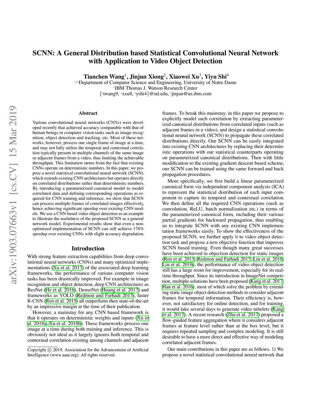 Various convolutional neural networks (CNNs) were developed recently that achieved accuracy comparable with that of human beings in computer vision tasks such as image recognition, object detection and tracking, etc. Most of these networks, however, process one single frame of image at a time, and may not fully utilize the temporal and contextual correlation typically present in multiple channels of the same image or adjacent frames from a video, thus limiting the achievable throughput. This limitation stems from the fact that existing CNNs operate on deterministic numbers. In this paper, we propose a novel statistical convolutional neural network (SCNN), which extends existing CNN architectures but operates directly on correlated distributions rather than deterministic numbers. By introducing a parameterized canonical model to model correlated data and defining corresponding operations as required for CNN training and inference, we show that SCNN can process multiple frames of correlated images effectively, hence achieving significant speedup over existing CNN models. We use a CNN based video object detection as an example to illustrate the usefulness of the proposed SCNN as a general network model. Experimental results show that even a non-optimized implementation of SCNN can still achieve 178% speedup over existing CNNs with slight accuracy degradation.